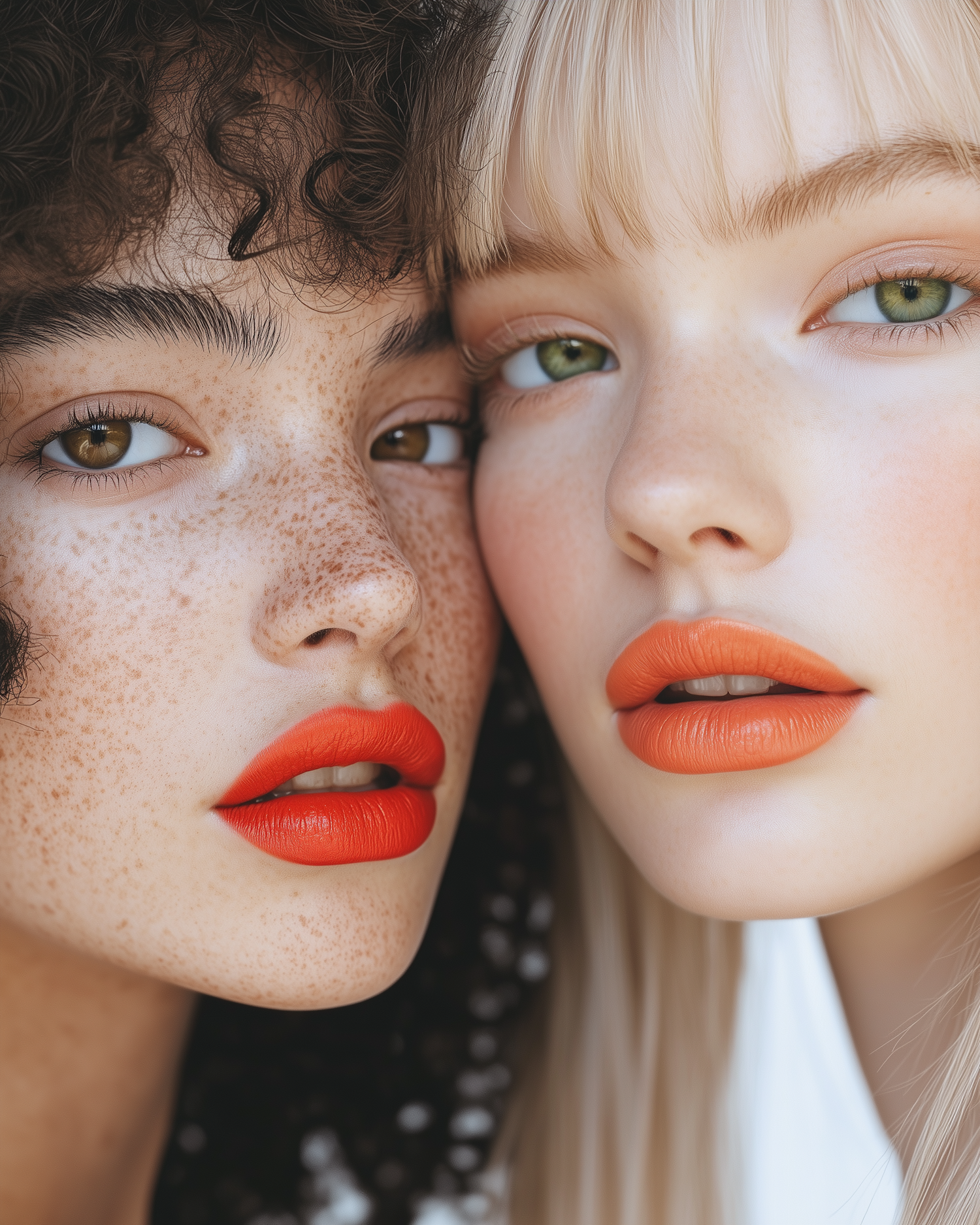 Close-up of two women with contrasting features, bold orange-red lipstick, and green eyes, showcasing freckles and artistic makeup.