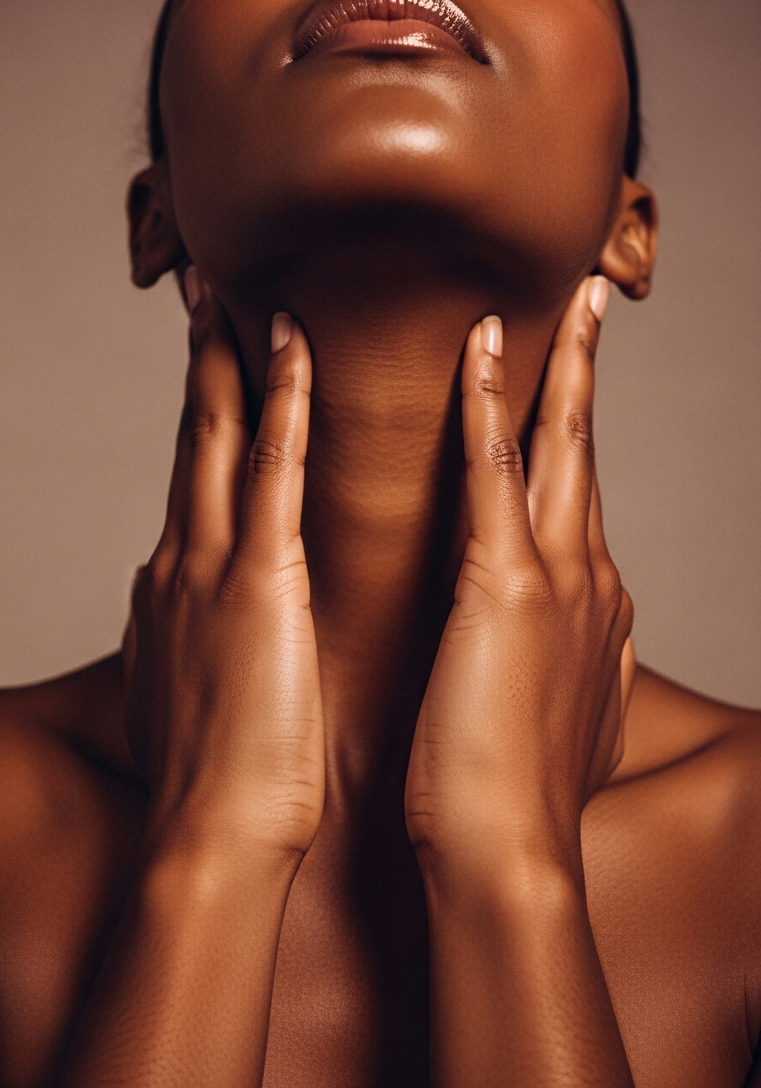 Close-up of a person's neck and hands with warm lighting, emphasizing smooth skin texture and a neutral background.