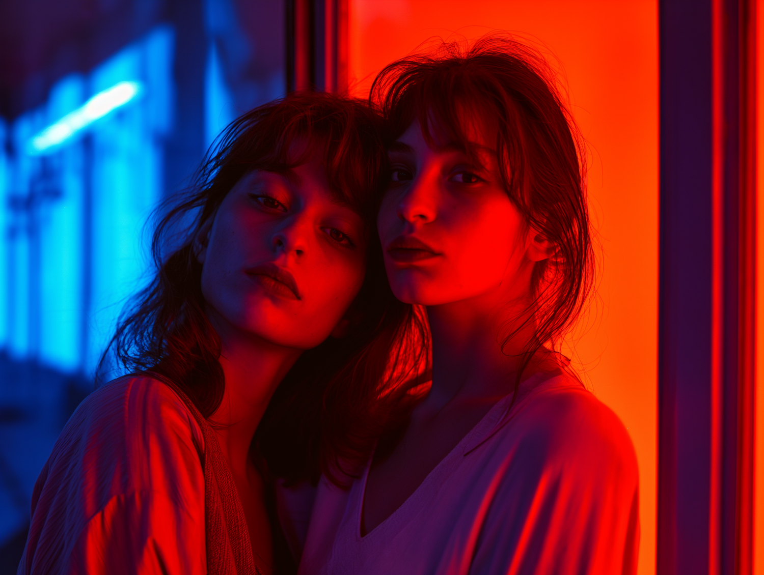 Two women in dramatic red and blue lighting, creating a striking and artistic visual contrast.