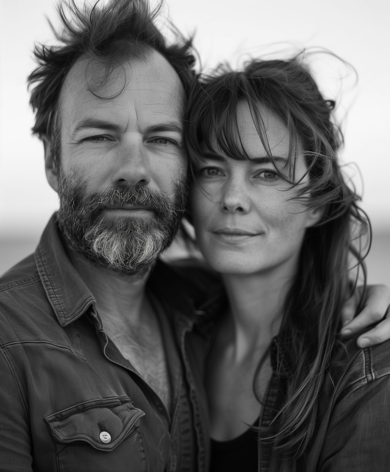 Black-and-white portrait of a couple with intimate expressions, rugged and serene, against a softly blurred background.