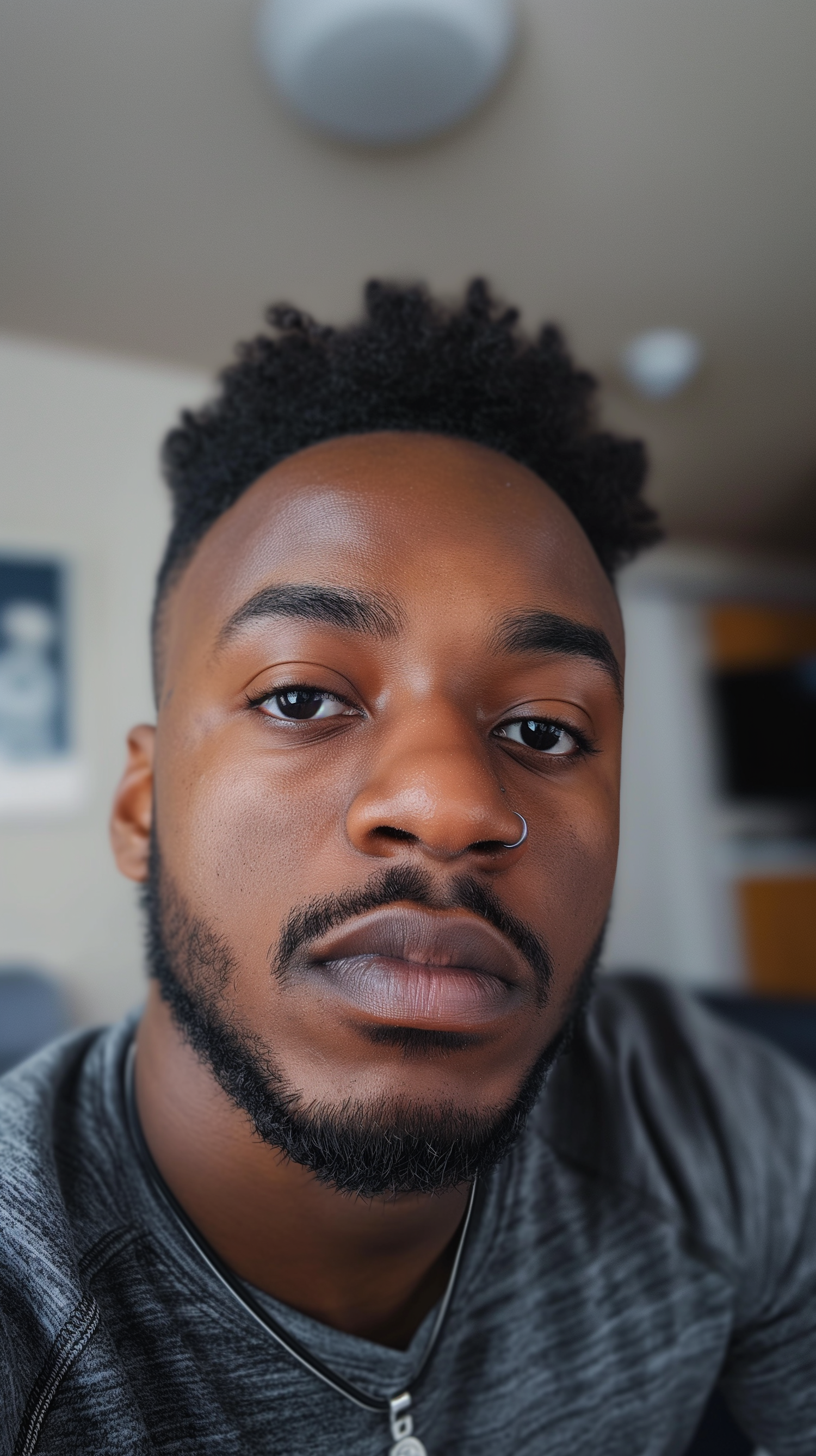 Close-up selfie of a young Black man with curly hair, beard, and nose ring, wearing a gray shirt and necklace.