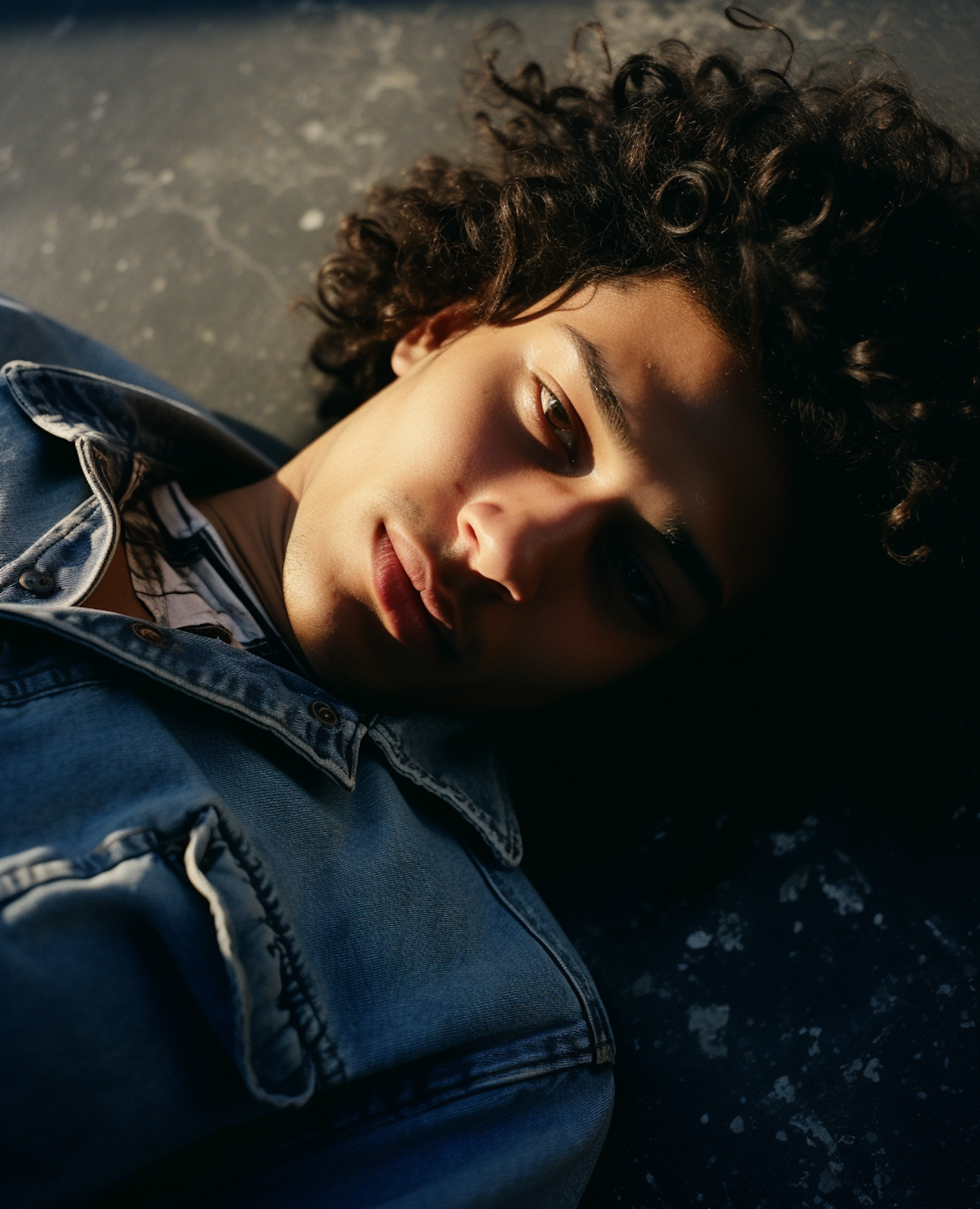 Young man with curly hair in denim jacket lying on a textured surface, bathed in warm sunlight, creating a contemplative mood.
