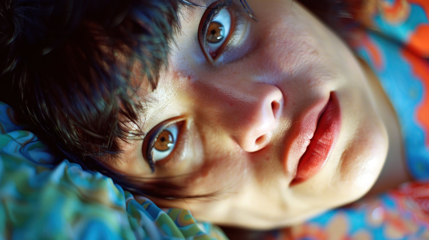 Close-up of a woman with brown eyes and red lips, lying on a colorful pillow with blue, green, and orange patterns.