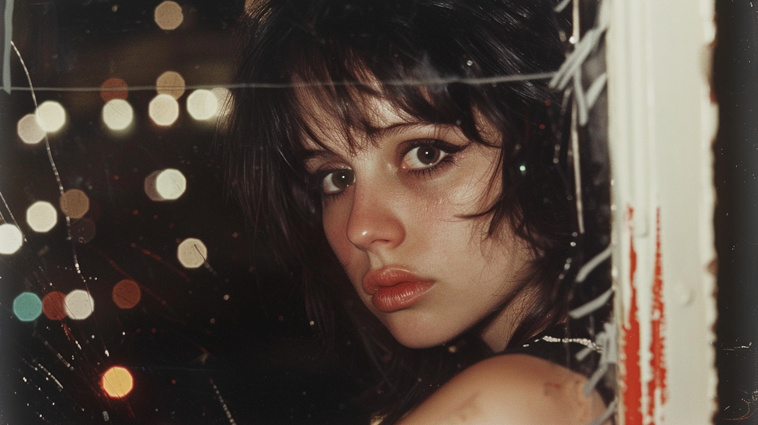 A young woman with dark hair and expressive eyes gazes at the camera, set against a backdrop of blurred city lights.