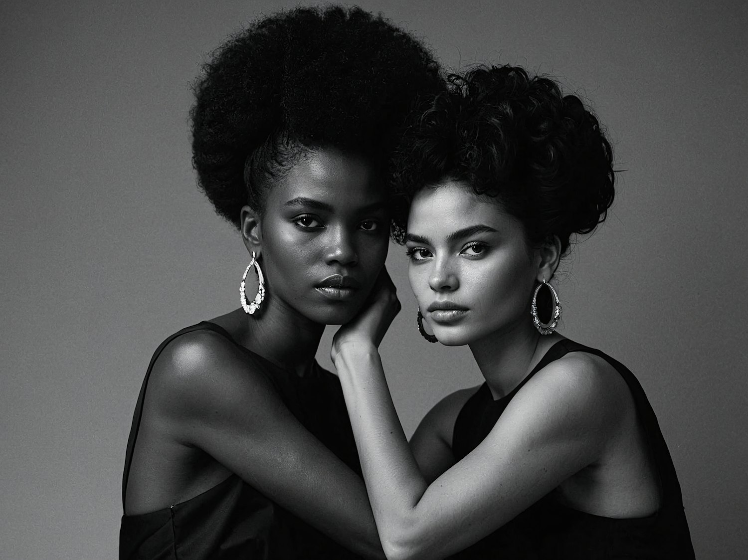 Black and white portrait of two women with afro and curly hairstyles, wearing hoop earrings and black tops, exuding elegance and unity.