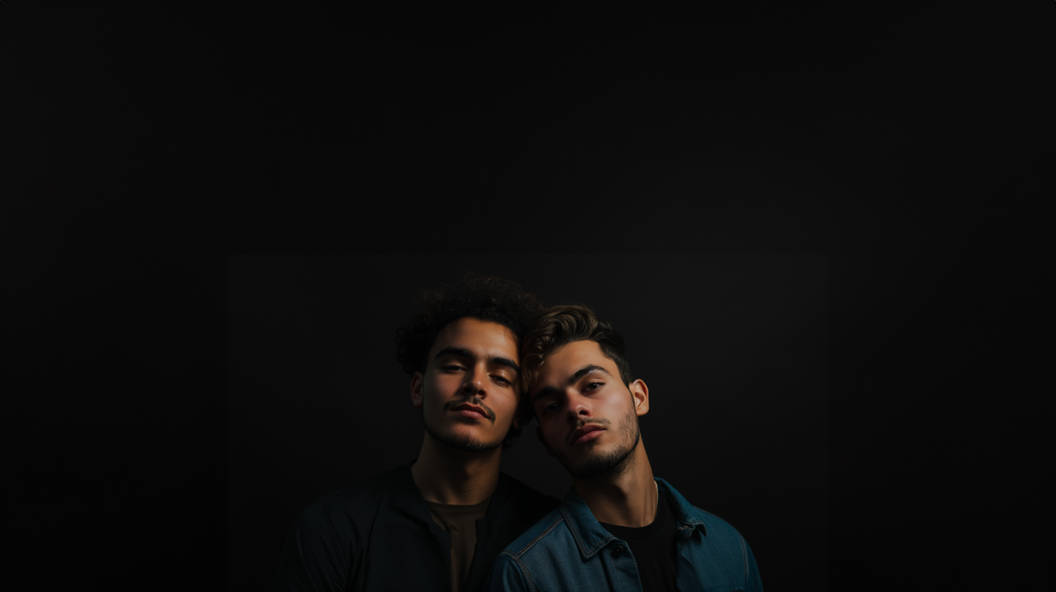 Two young men with contrasting hair and skin tones pose closely against a dark background, creating a sense of intimacy and connection.