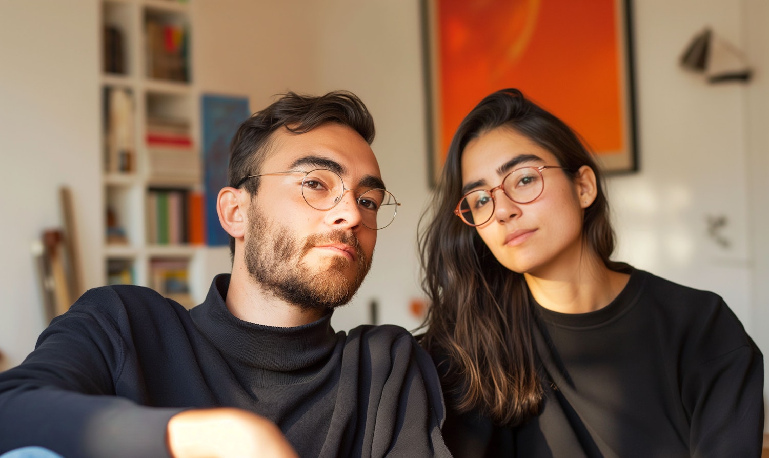 Young couple with glasses in a cozy room, wearing black outfits. Warm lighting and a vibrant orange artwork in the background.