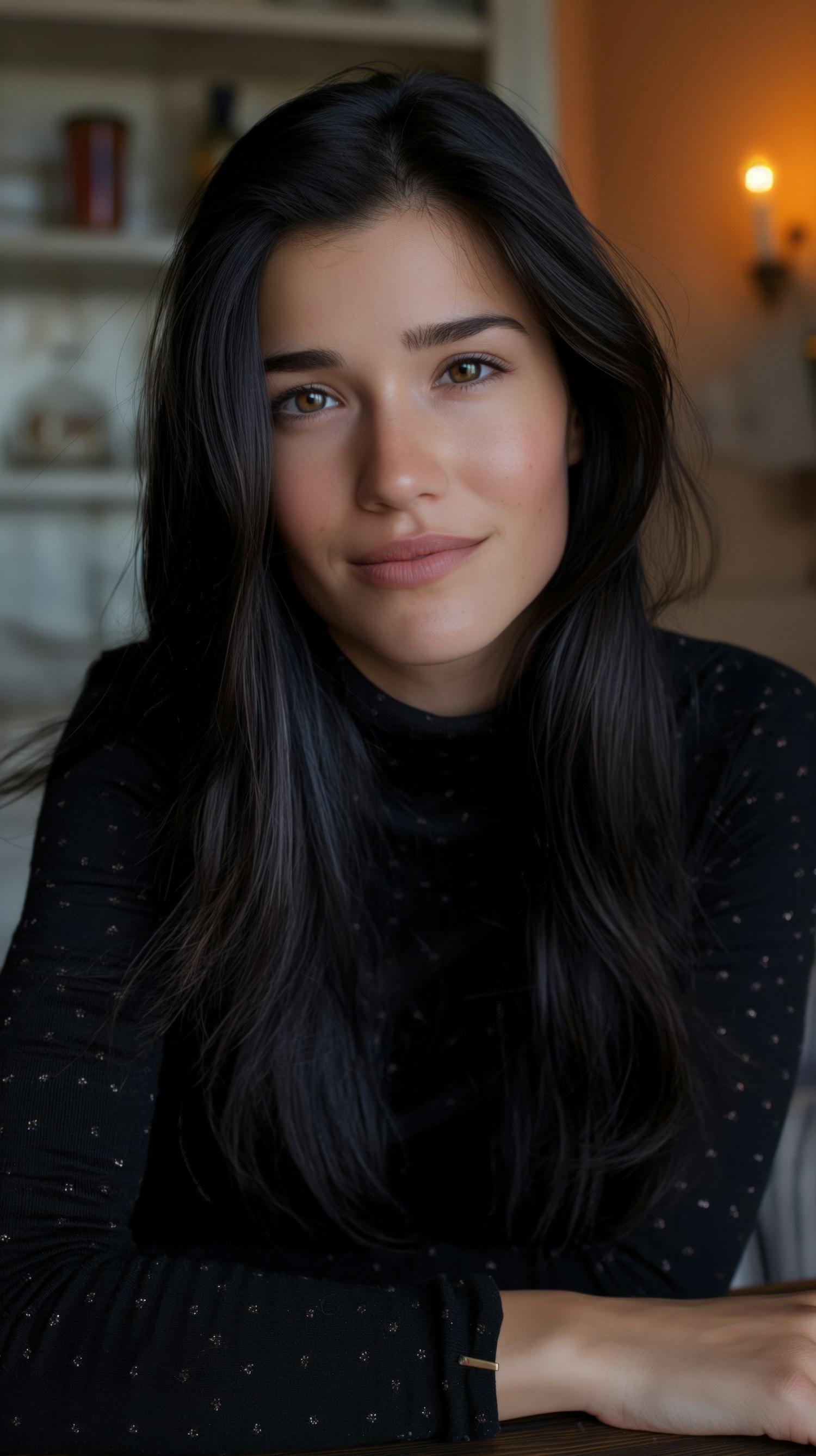 Young woman with long dark hair and brown eyes, wearing a black patterned top, seated indoors with a warm, blurred background.