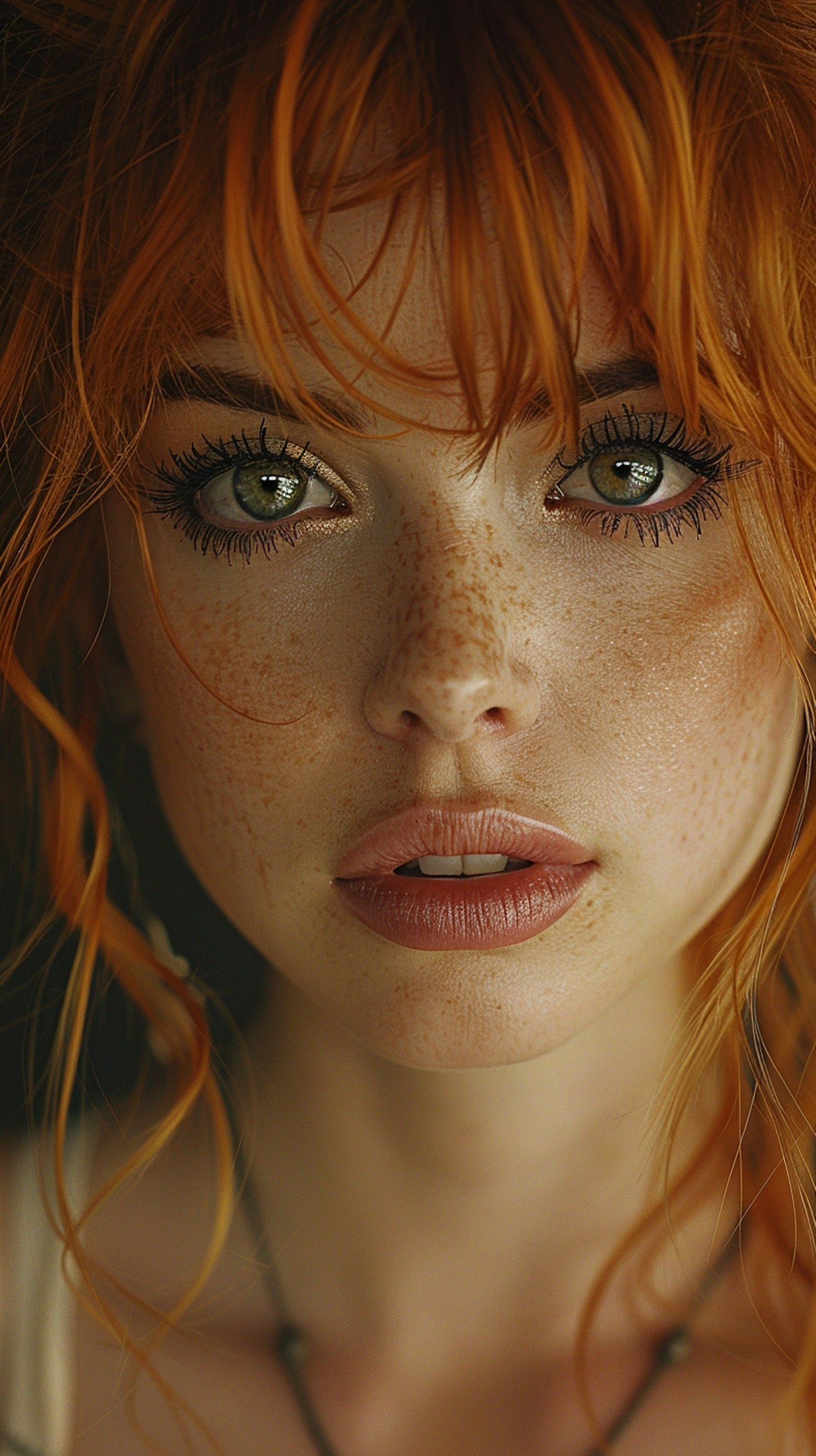 Close-up portrait of a freckled woman with red hair and green eyes, showcasing natural beauty and striking features.