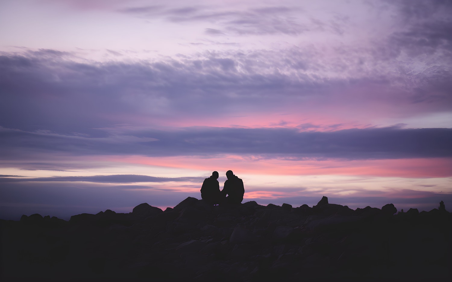 Silhouetted figures on rocky terrain against a vibrant sunset sky with purples, pinks, and oranges, creating a serene atmosphere.
