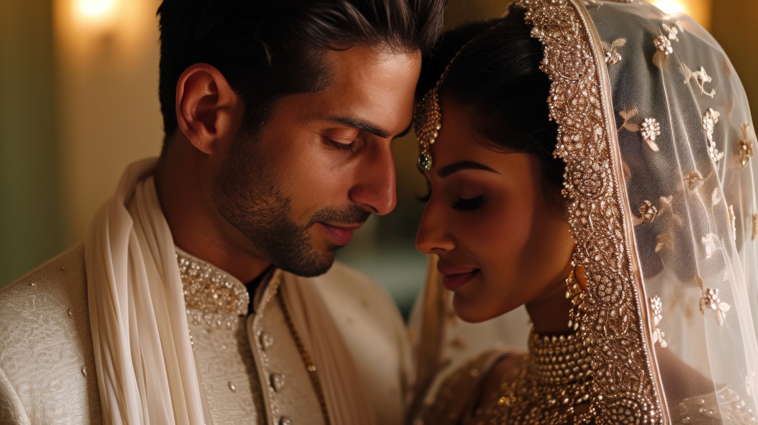 Close-up of a South Asian couple in traditional wedding attire, sharing an intimate moment with warm lighting and intricate details.