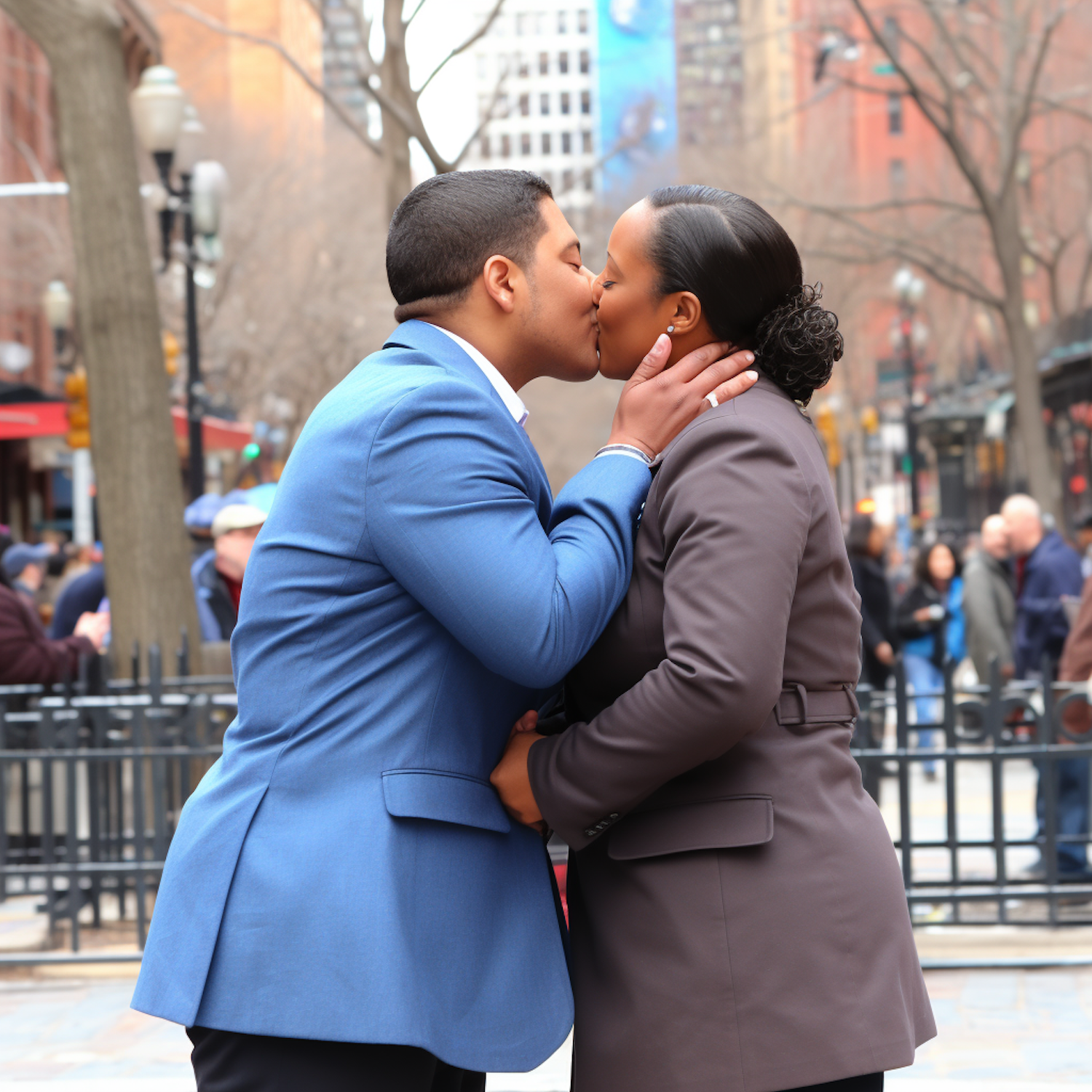 A couple shares a romantic kiss in a bustling city street, surrounded by blurred pedestrians and urban buildings.