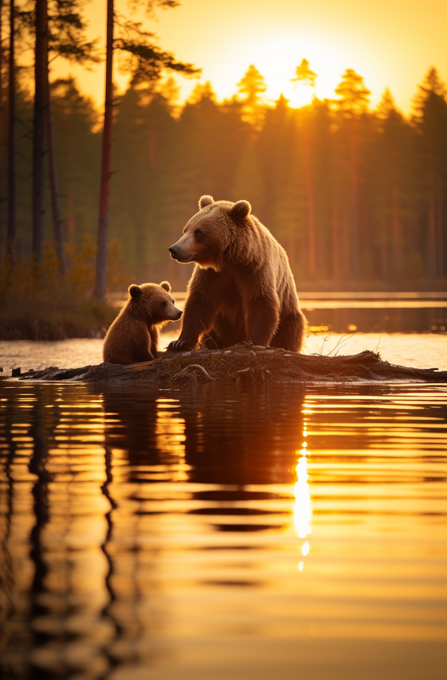 Mother bear and cub bask in golden sunset by a tranquil lake, surrounded by silhouetted trees and warm reflections.