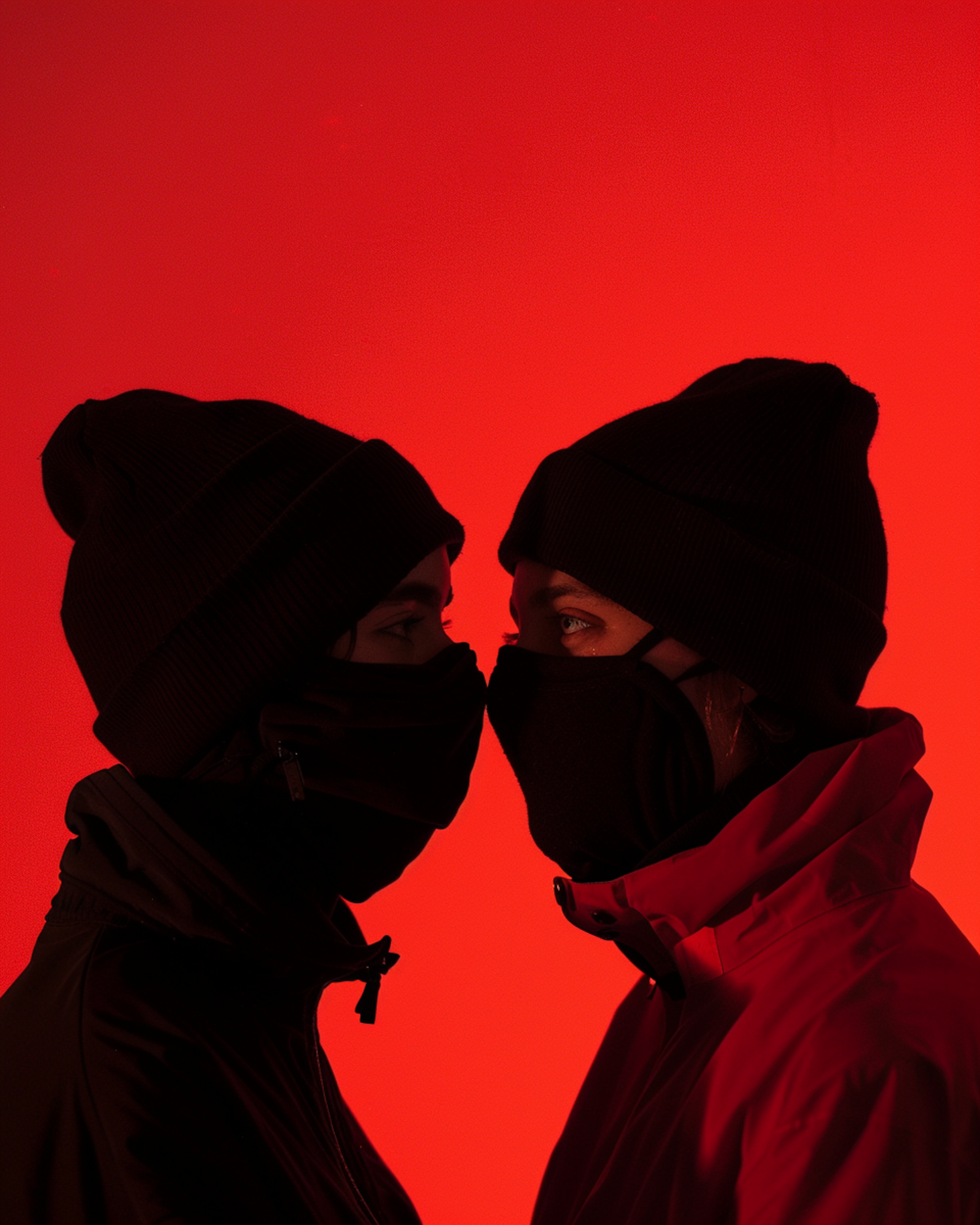 Two masked individuals in black beanies face each other against a vivid red background, creating a dramatic and intense scene.