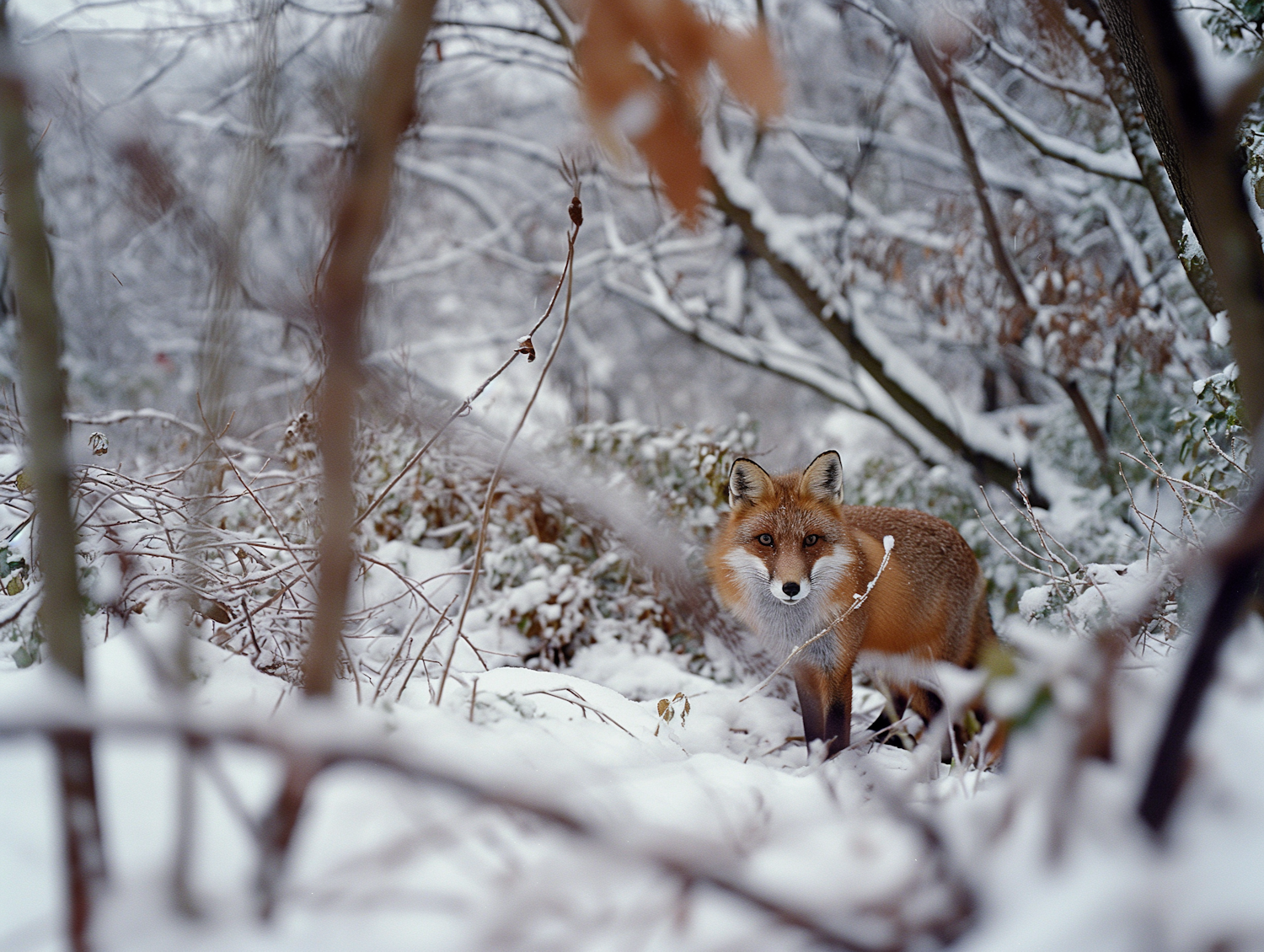 A red fox stands alert in a snowy forest, its vibrant fur contrasting against the white snow, surrounded by snow-covered branches.