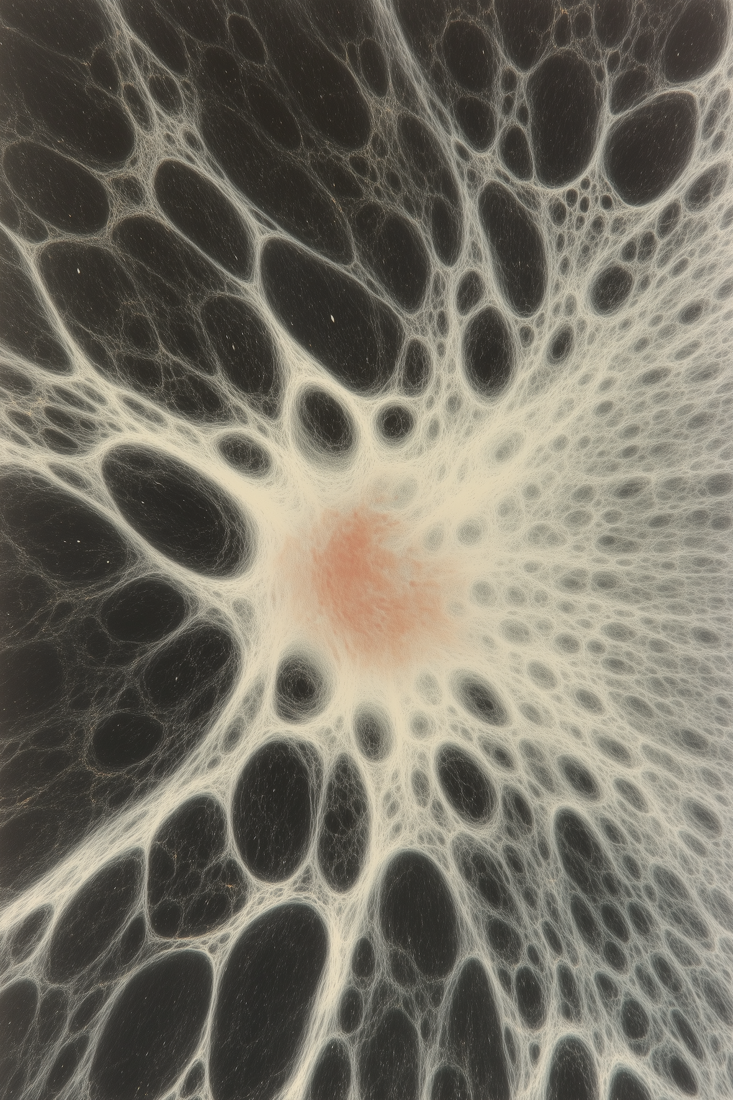 Abstract web-like structure with pink center and white patterns on a black background, resembling cellular or biological forms.
