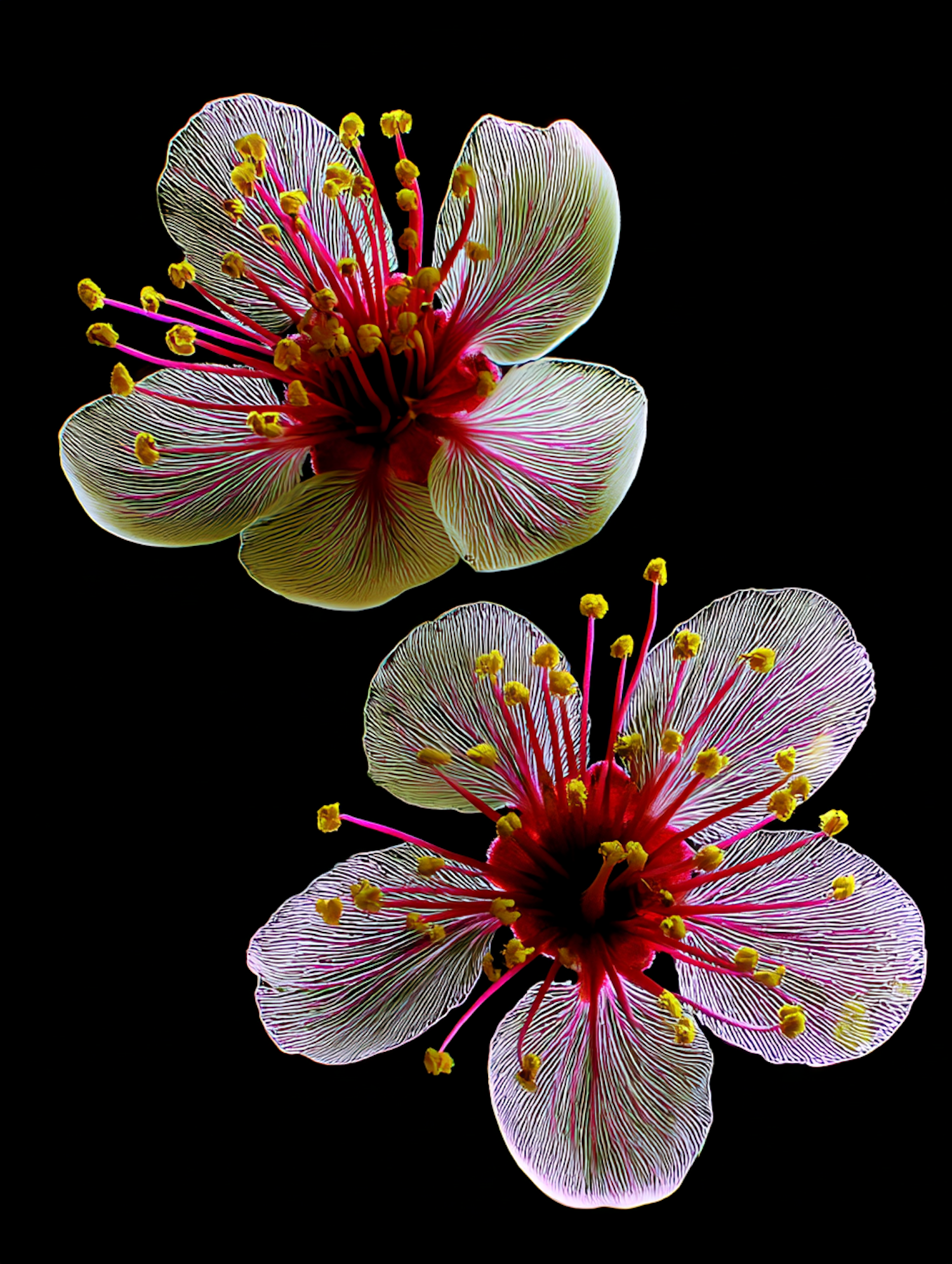 Close-up of two vibrant flowers with intricate pink and white petals, red centers, and yellow stamens on a black background.