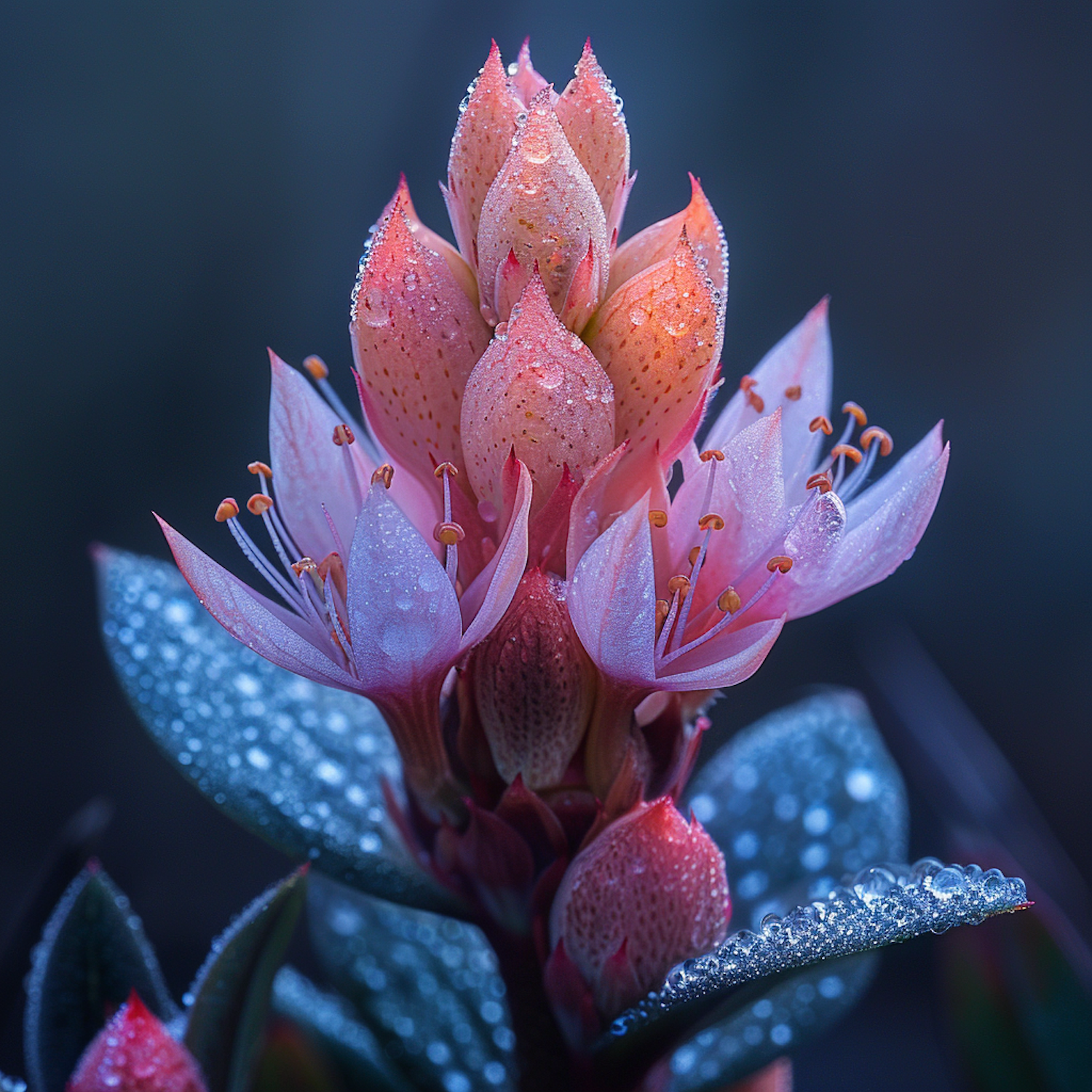 Close-up of a pink flower with dewdrops on petals and leaves, set against a soft blue background, creating a fresh and serene scene.