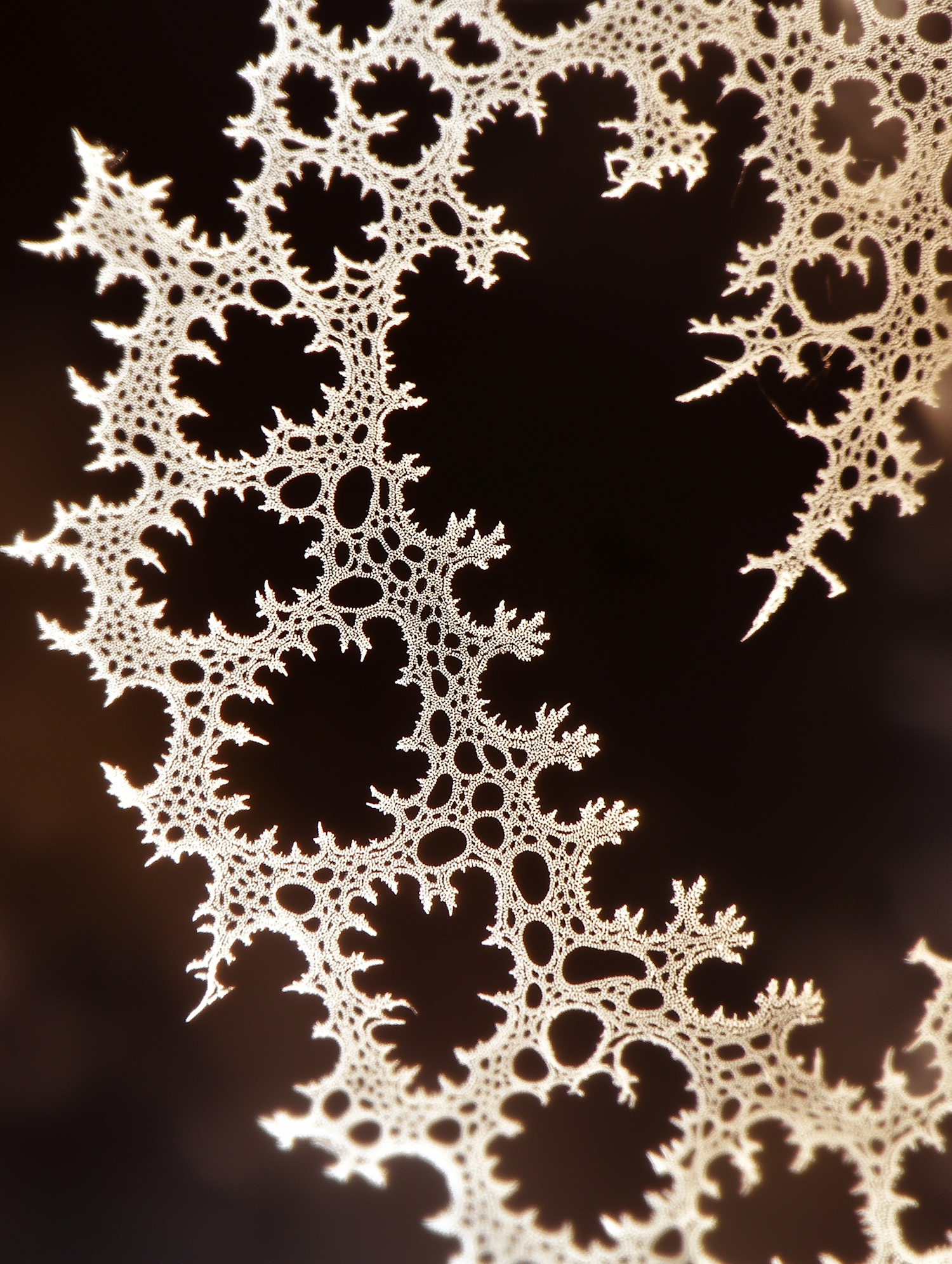 Intricate lace-like fractal pattern with spiky edges against a dark background, resembling coral or frost.