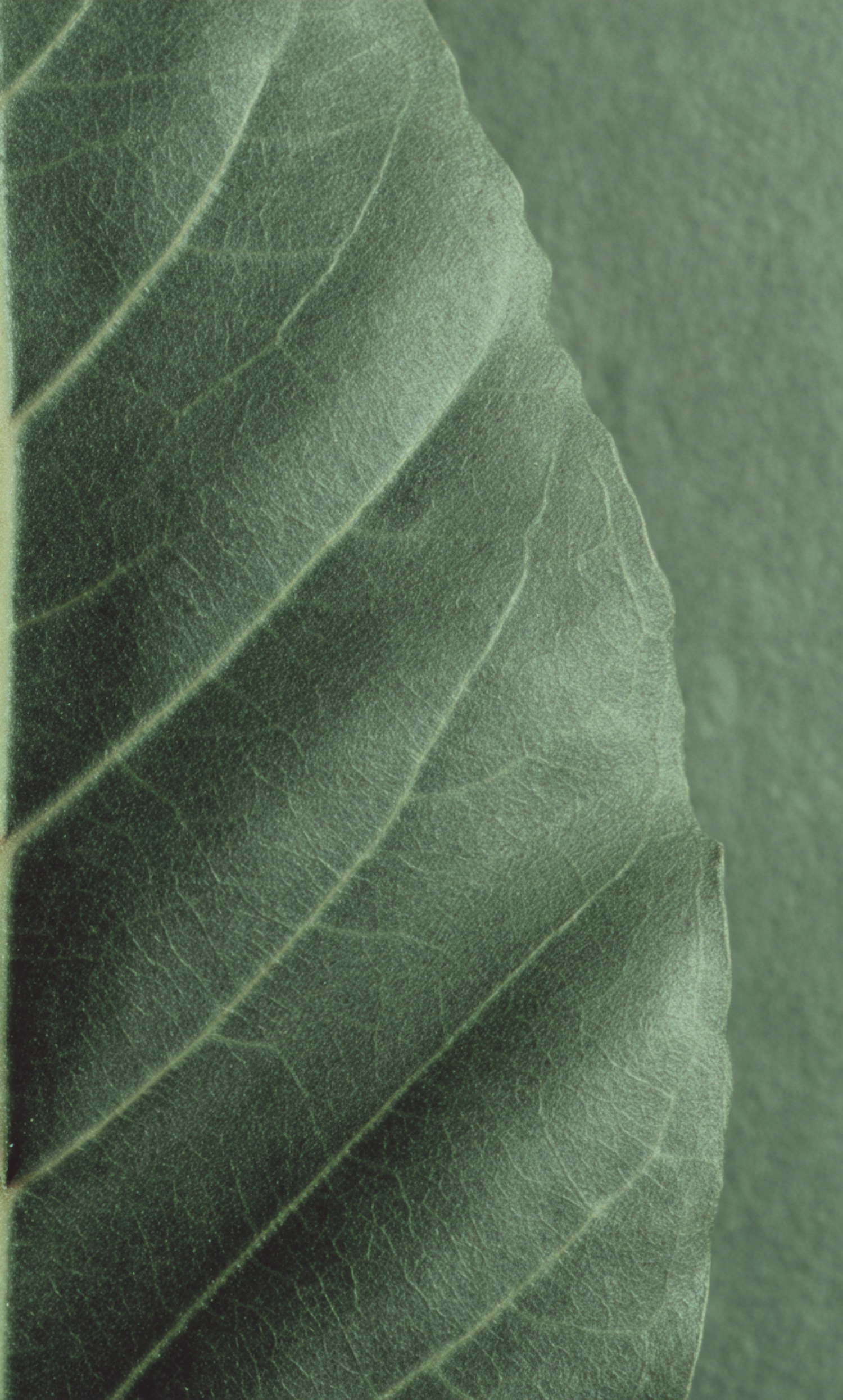 Close-up of a green leaf with detailed veins and texture, set against a soft green background, emphasizing its natural beauty.