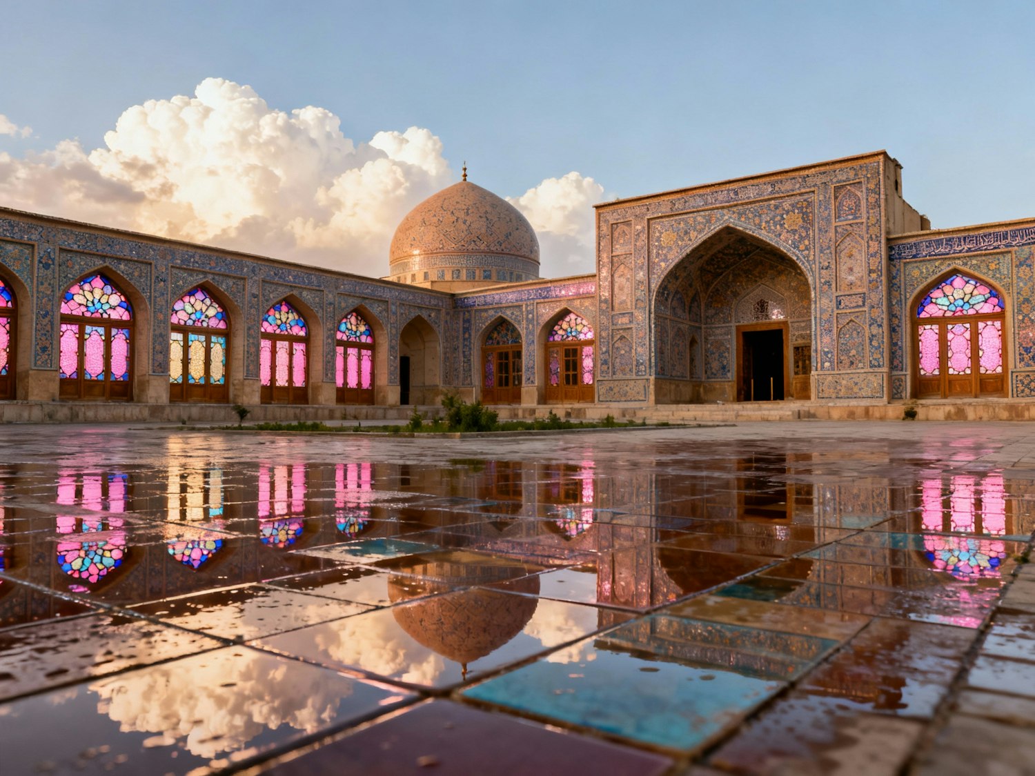 A mosque with intricate tilework and colorful stained glass windows reflecting on a wet courtyard under a serene sky.