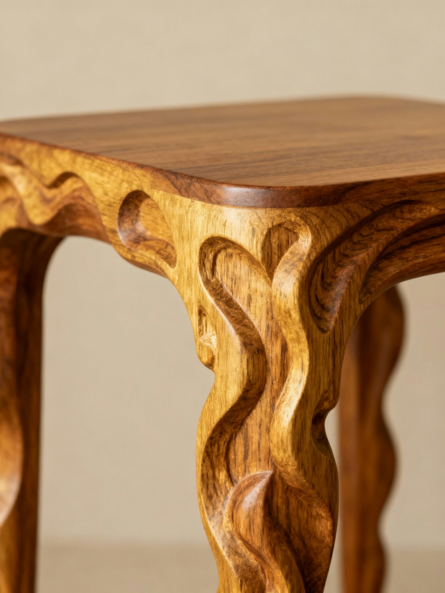 Professional interior design photography, warm and textured atmosphere, soft natural lighting, retro-modern aesthetic, mid-century inspired furniture, crafted wooden details, neutral tones with accents of earthy colors, editorial style, timeless and sophisticated mood. A sculptural wooden side table with organic carved details, photographed on a plain neutral background. Studio-style shot emphasizing the craftsmanship of the wood and the timeless retro-modern design, with soft shadows and warm highlights.
