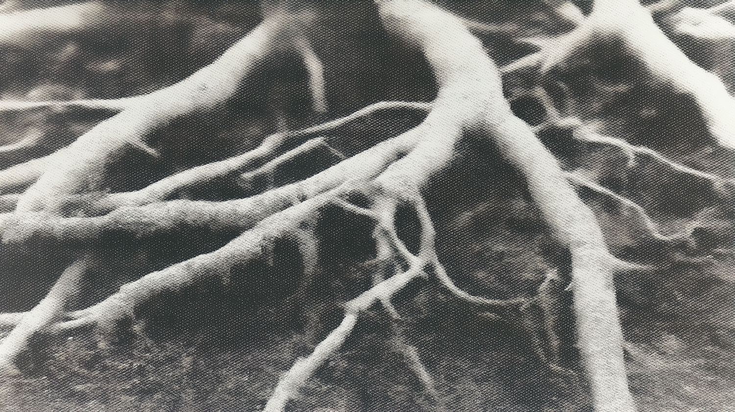 Monochromatic close-up of gnarled tree roots with a vintage, grainy texture, highlighting intricate patterns and organic forms.