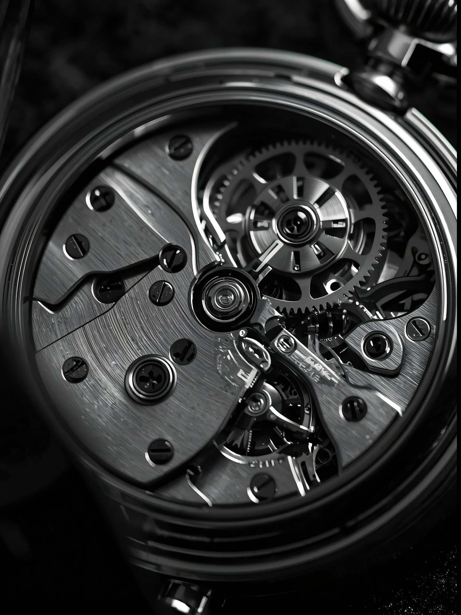 Close-up of a mechanical watch's intricate inner workings, showcasing polished gears and screws with a focus on precision and craftsmanship.