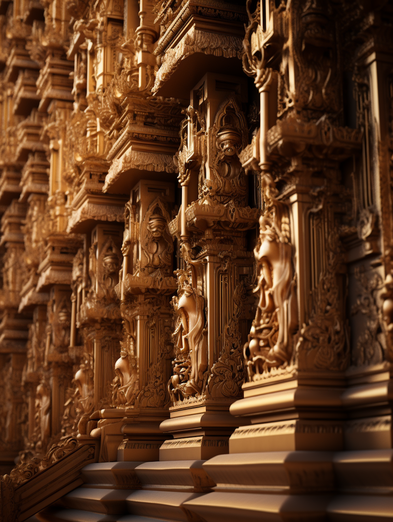 Intricate golden carvings on a temple wall, showcasing detailed figures and ornate patterns in a rich, opulent design.