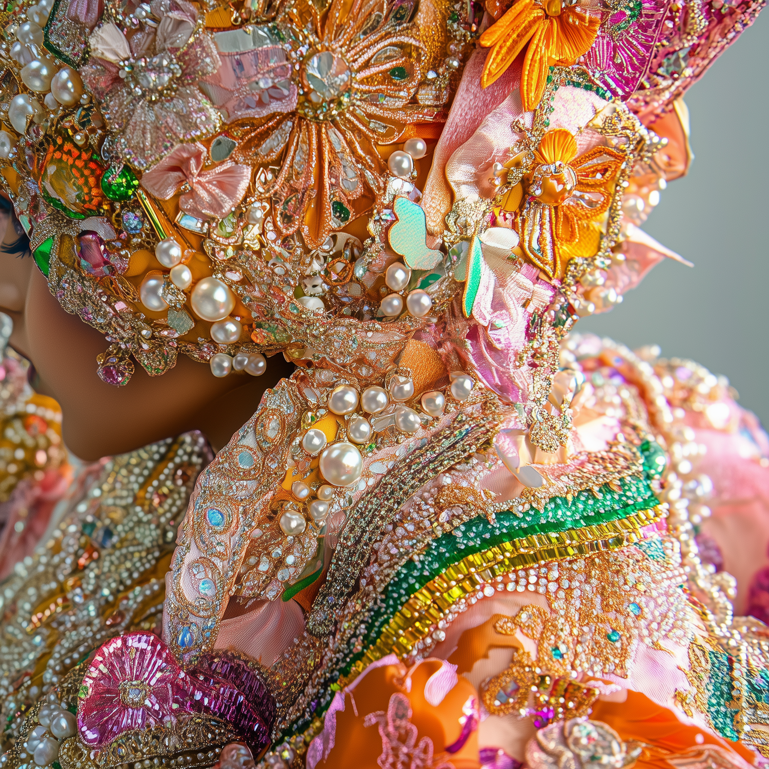 Intricately designed costume with pearls, sequins, and floral motifs in vibrant colors, creating a luxurious and festive look.