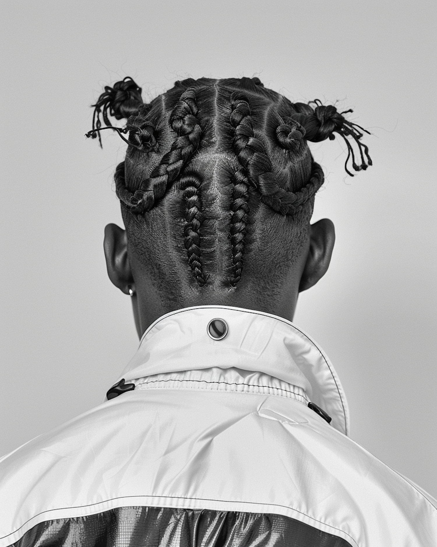 Intricate braided hairstyle with small buns on a black man, wearing a shiny jacket with a high collar, viewed from behind.