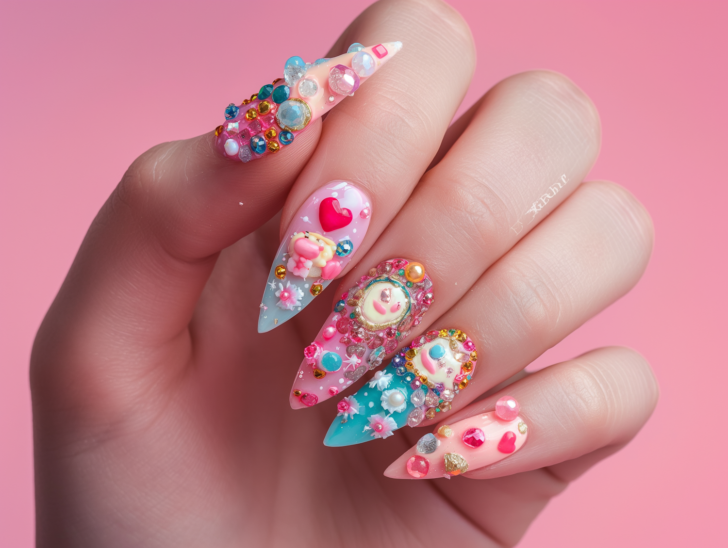 Intricate 3D nail art with colorful beads, gems, and playful designs on long, pointed nails against a soft pink background.