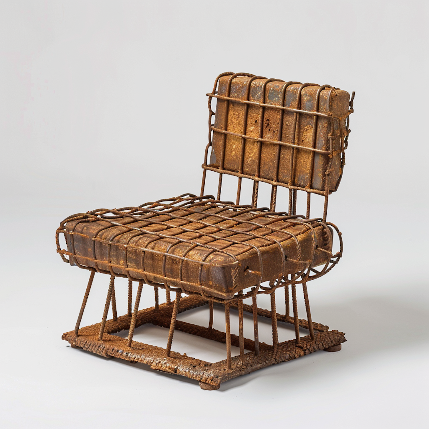Rusted metal and brick chair with industrial design, featuring a grid pattern and minimalist structure. Unique and rugged aesthetic.