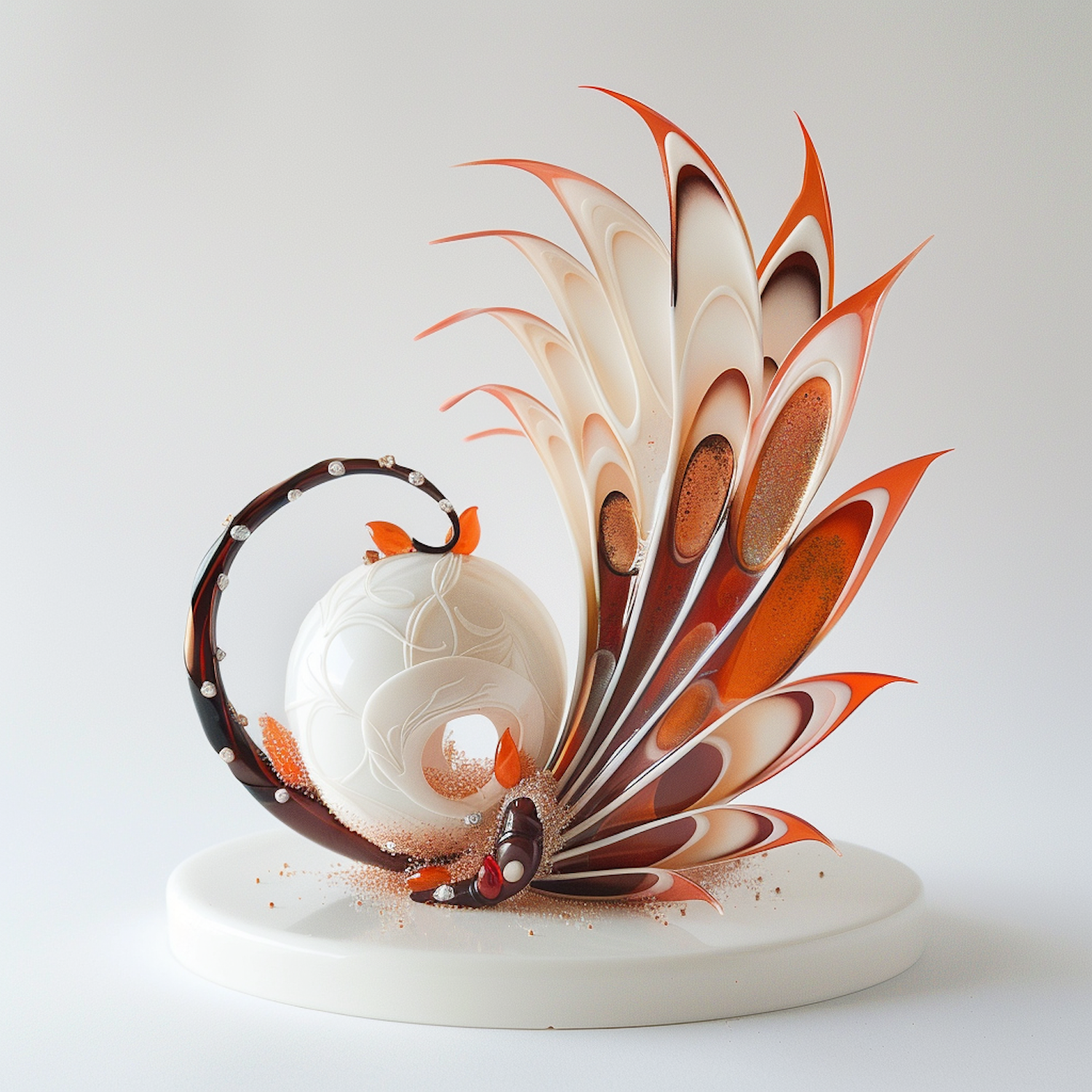 Abstract sculpture with elegant feather-like structures in orange, brown, and cream, set on a white base. Modern and dynamic design.