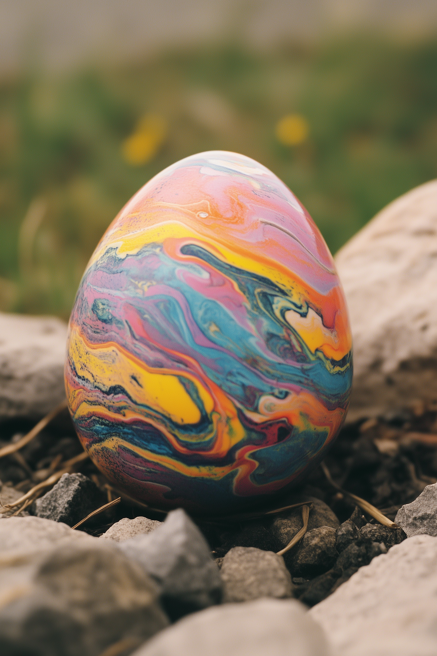 Colorful marbled egg with swirling patterns among gray stones, set against a blurred green background with hints of yellow flowers.