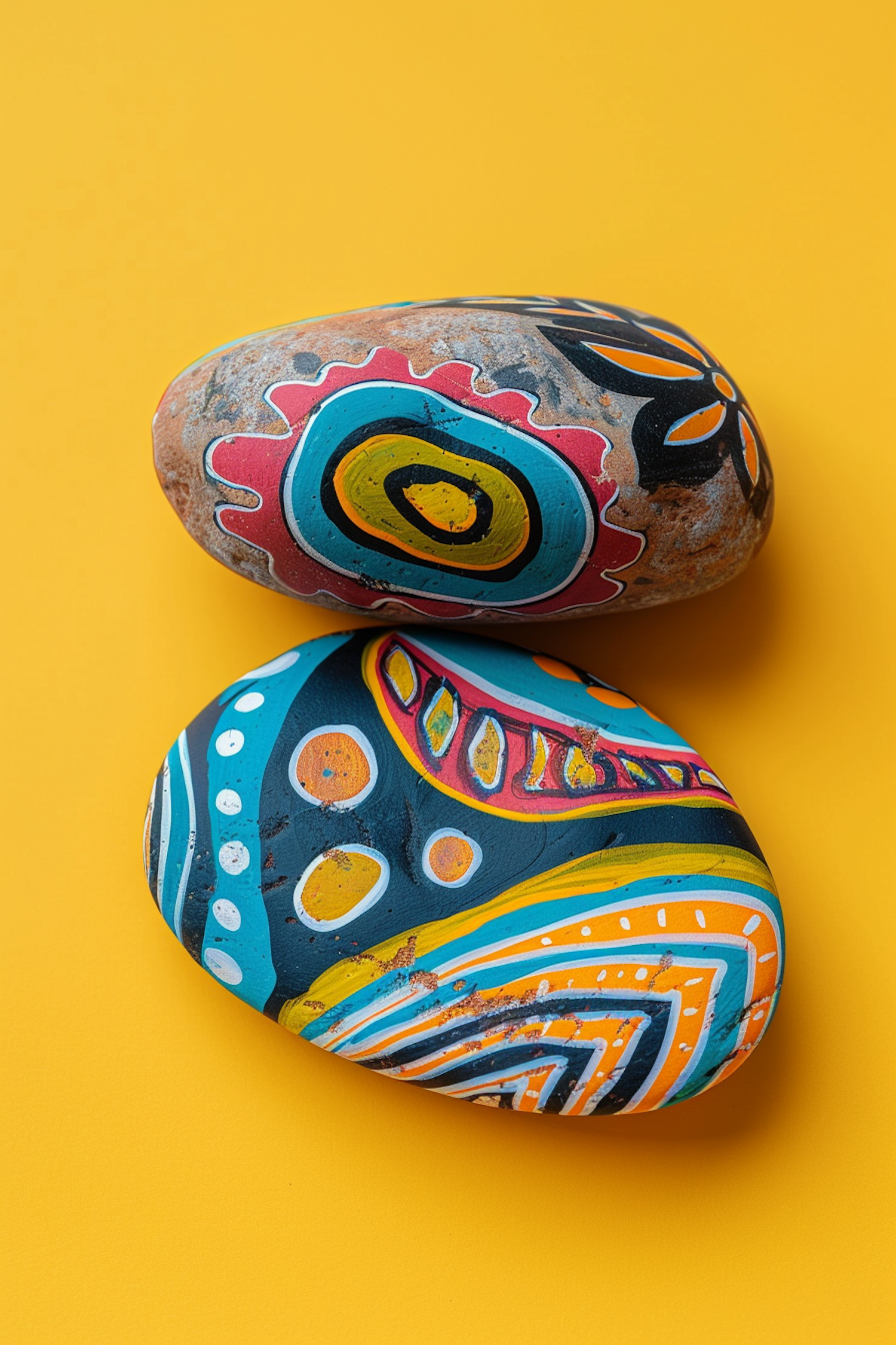 Intricately Painted Rocks on Mustard-Yellow Background