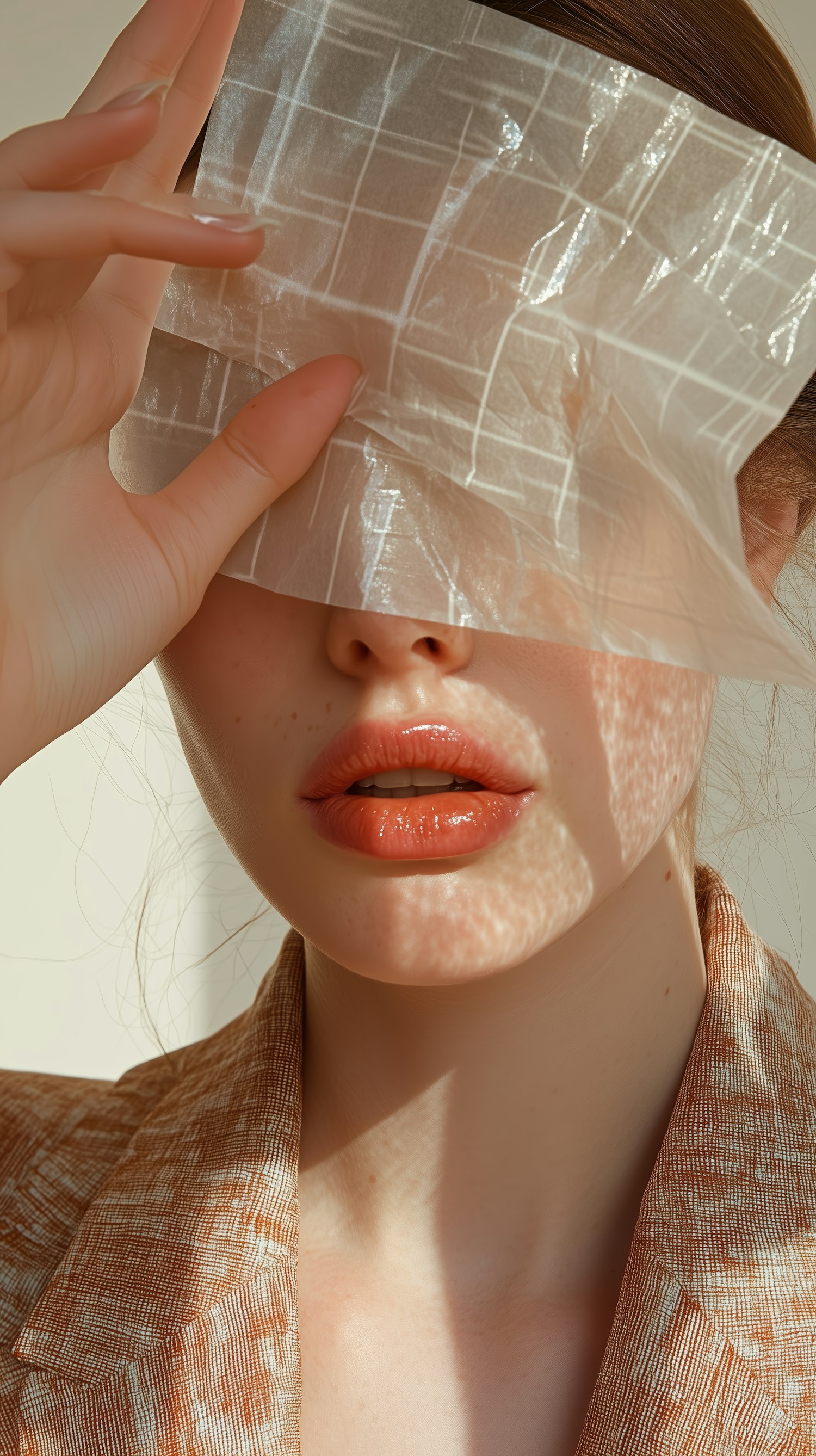 Close-up of a woman with glossy lips and a translucent sheet over her eyes, creating artistic light patterns on her face.