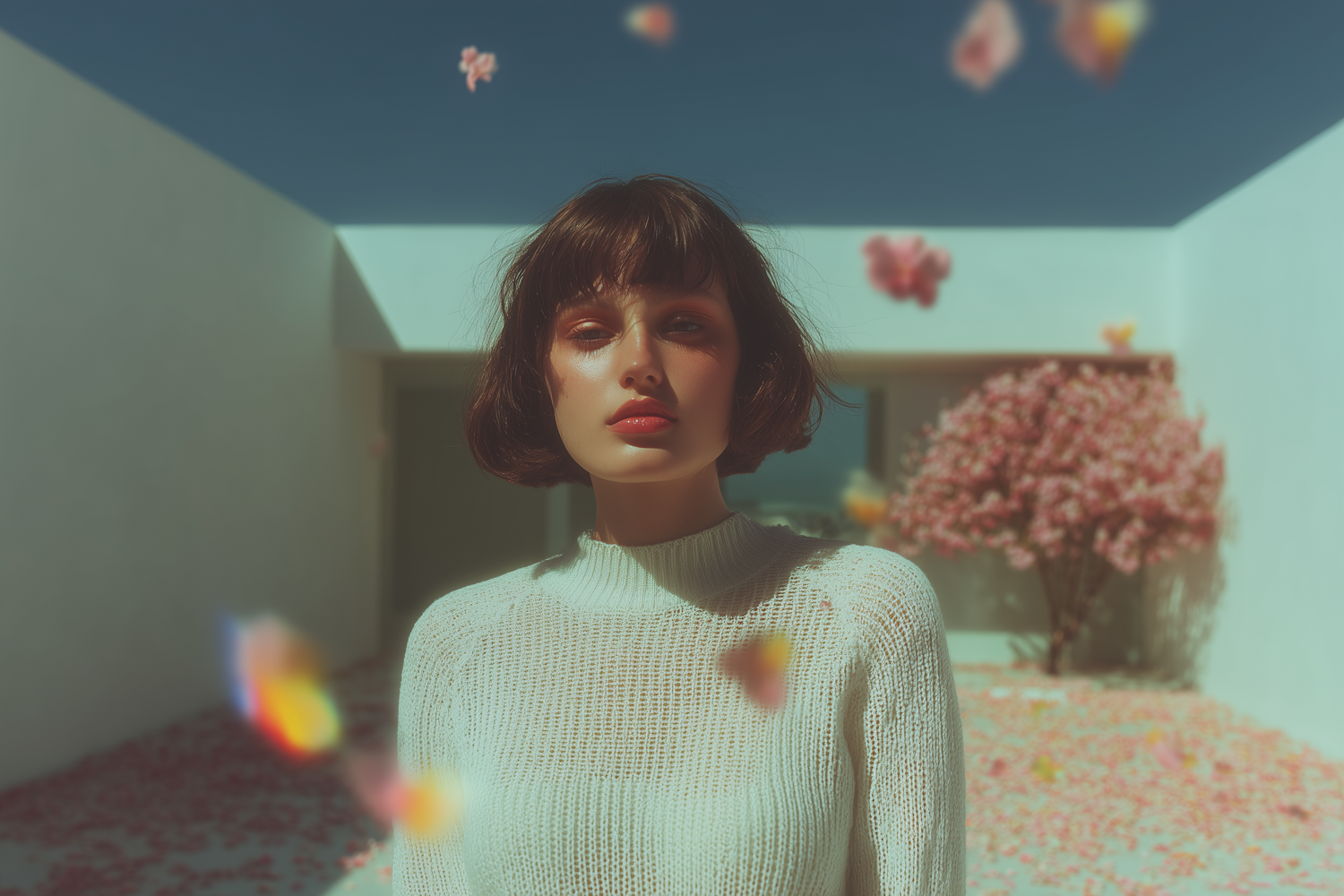 A serene portrait of a woman in a white sweater, set against a minimalist outdoor backdrop with a blooming tree and floating petals.