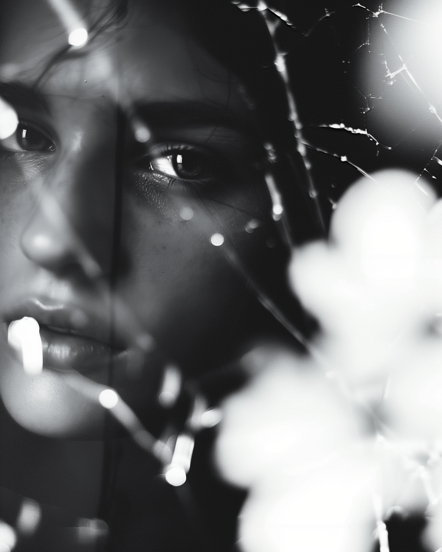 Black and white portrait of a woman with cracked glass effect, creating an abstract and contemplative mood.
