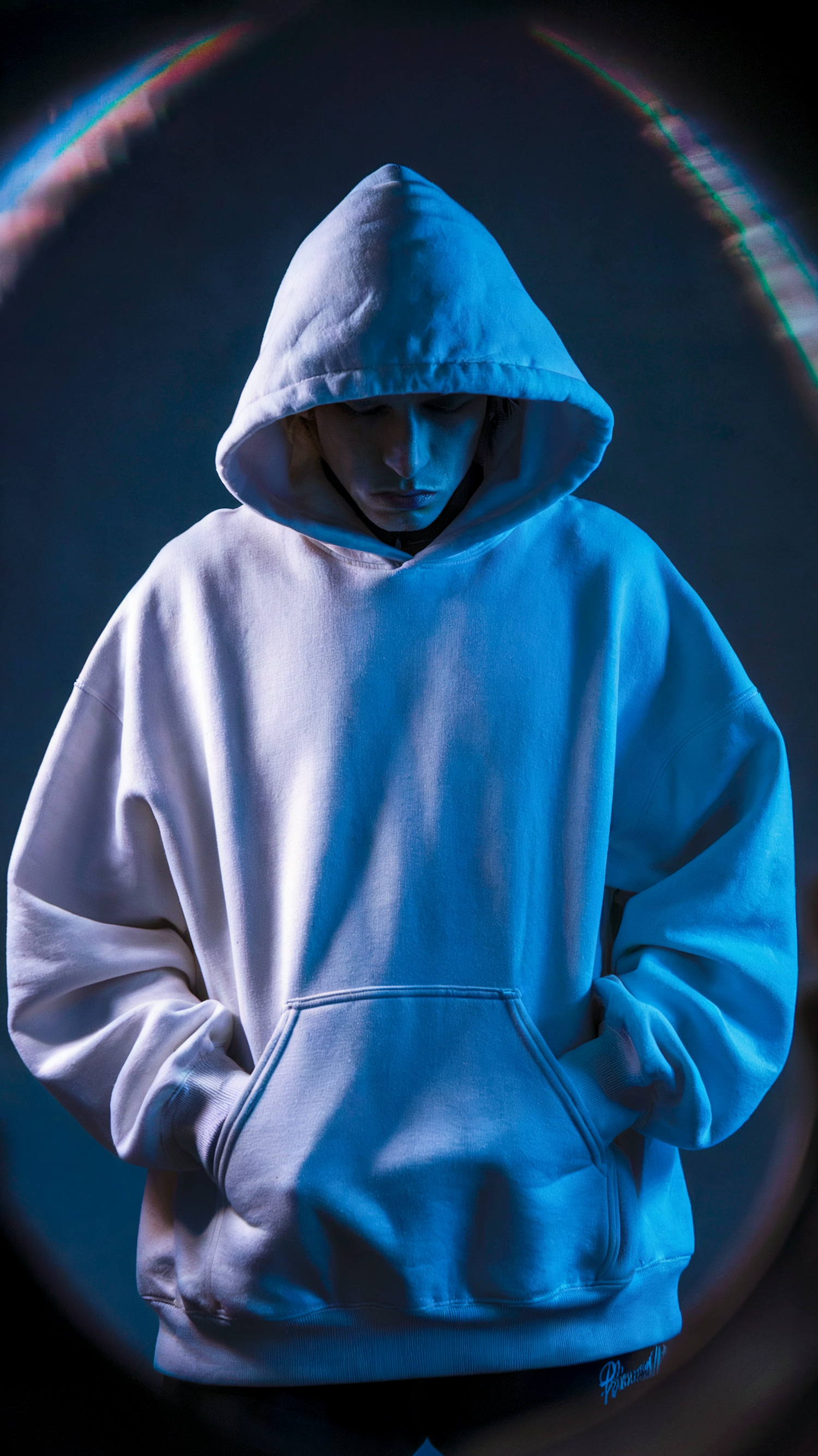 Mysterious figure in a white hoodie under blue lighting, creating a cool, enigmatic atmosphere with a rainbow halo effect.