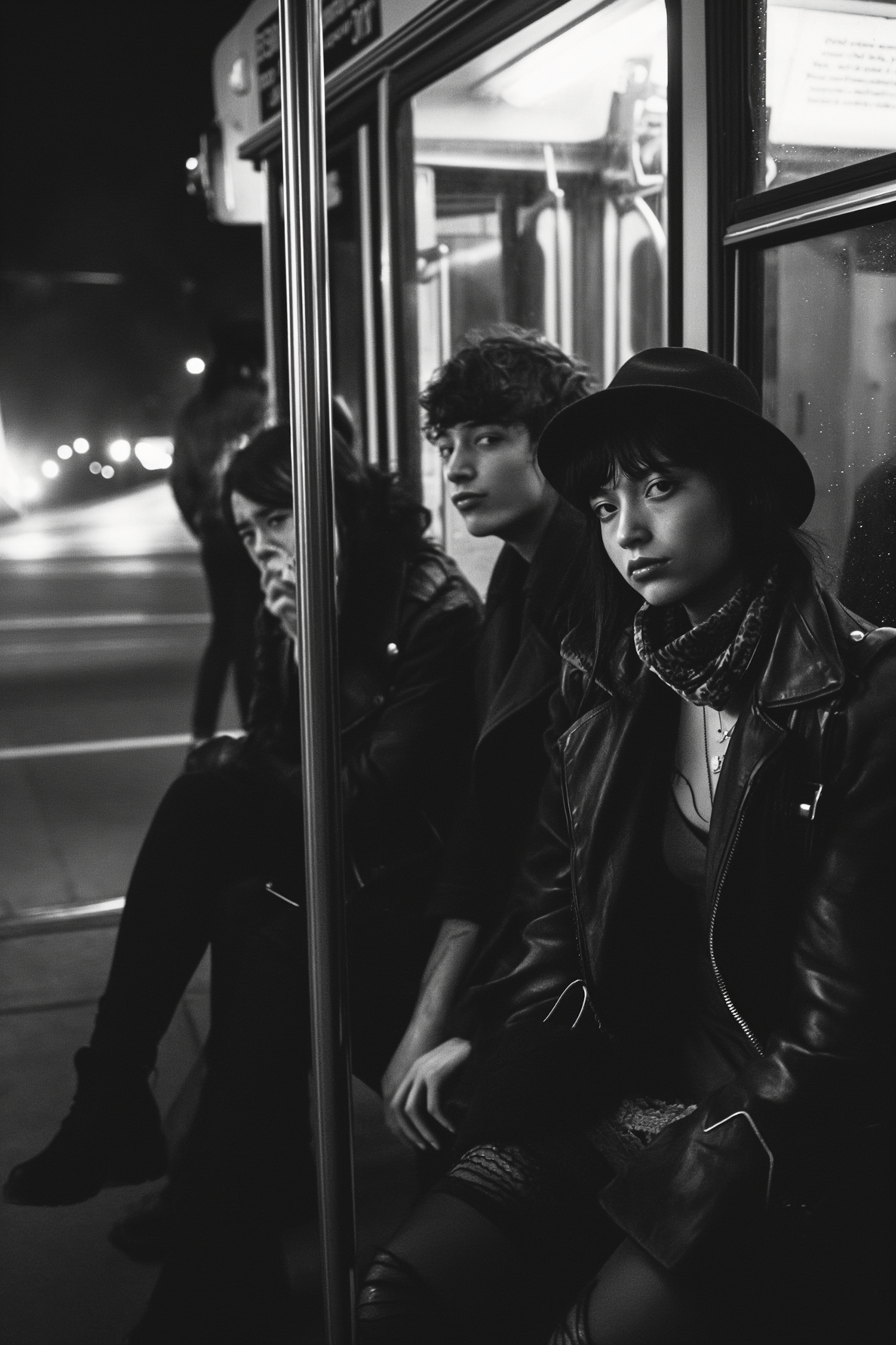 Moody black and white photo of three young adults on a night bus, capturing urban life and introspective expressions.