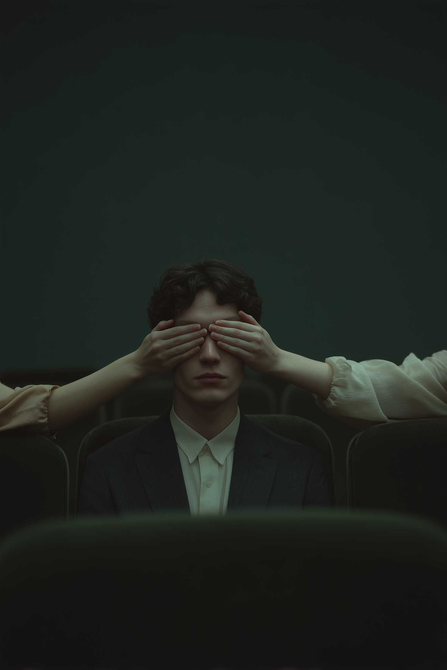 A man seated in a dim setting has his eyes obscured by two hands, creating an intimate and moody atmosphere with rich green hues.