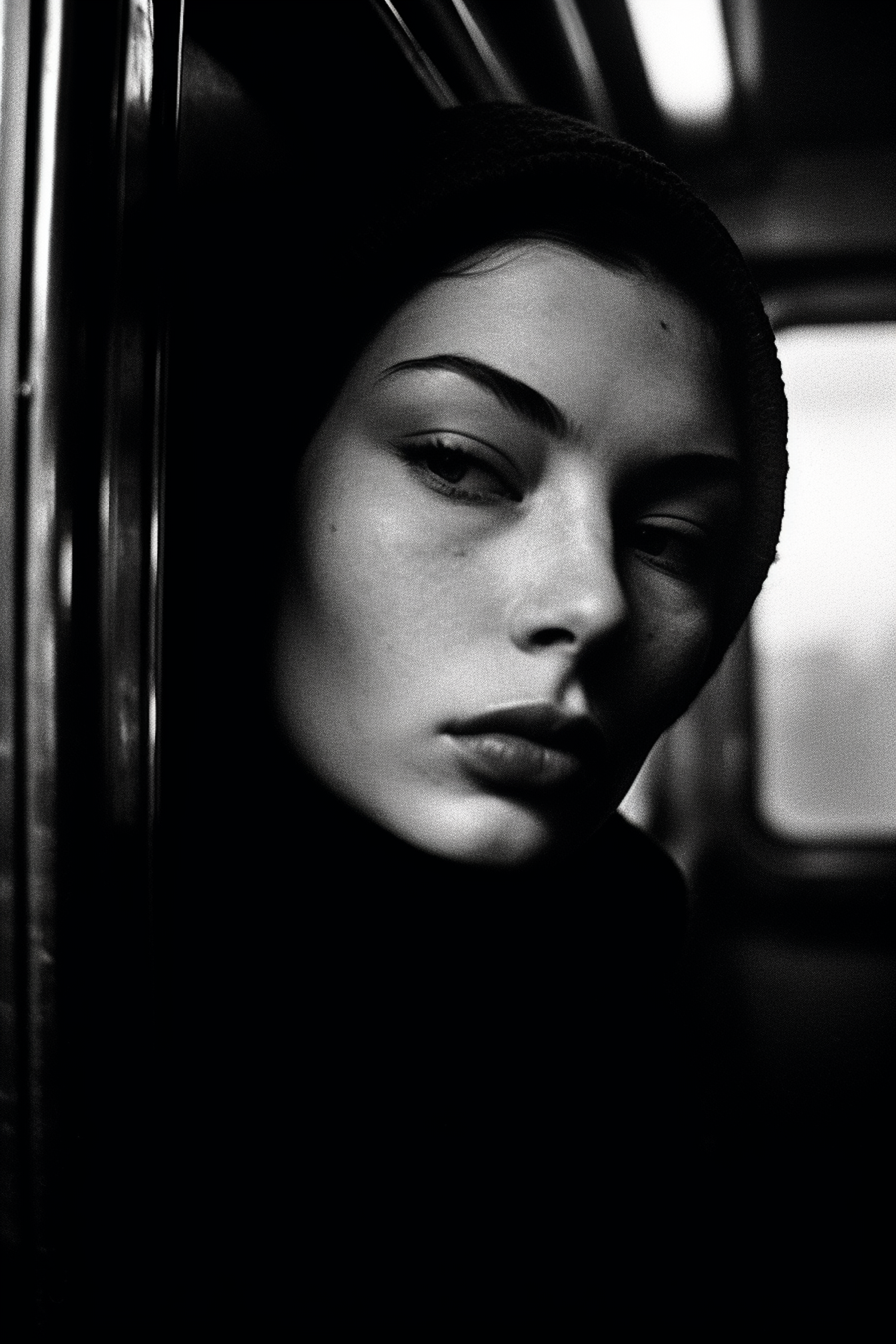 Black and white portrait of a young woman with a contemplative expression, set in a dimly lit vehicle interior.
