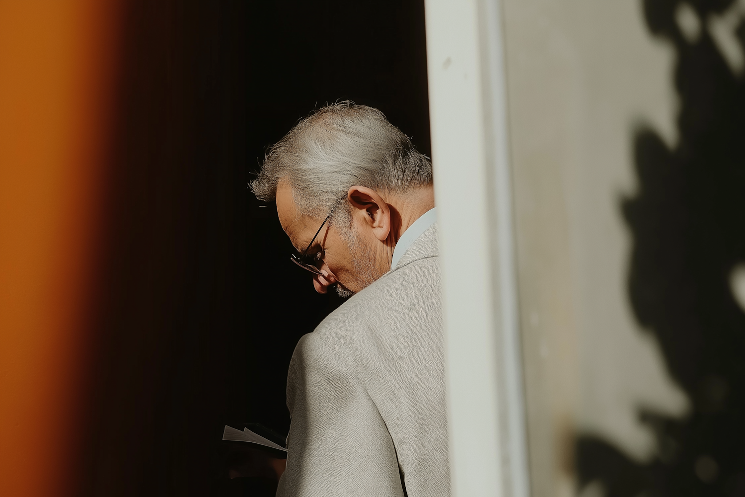 Elderly man in a light suit reading a book, with warm lighting and shadowed background.