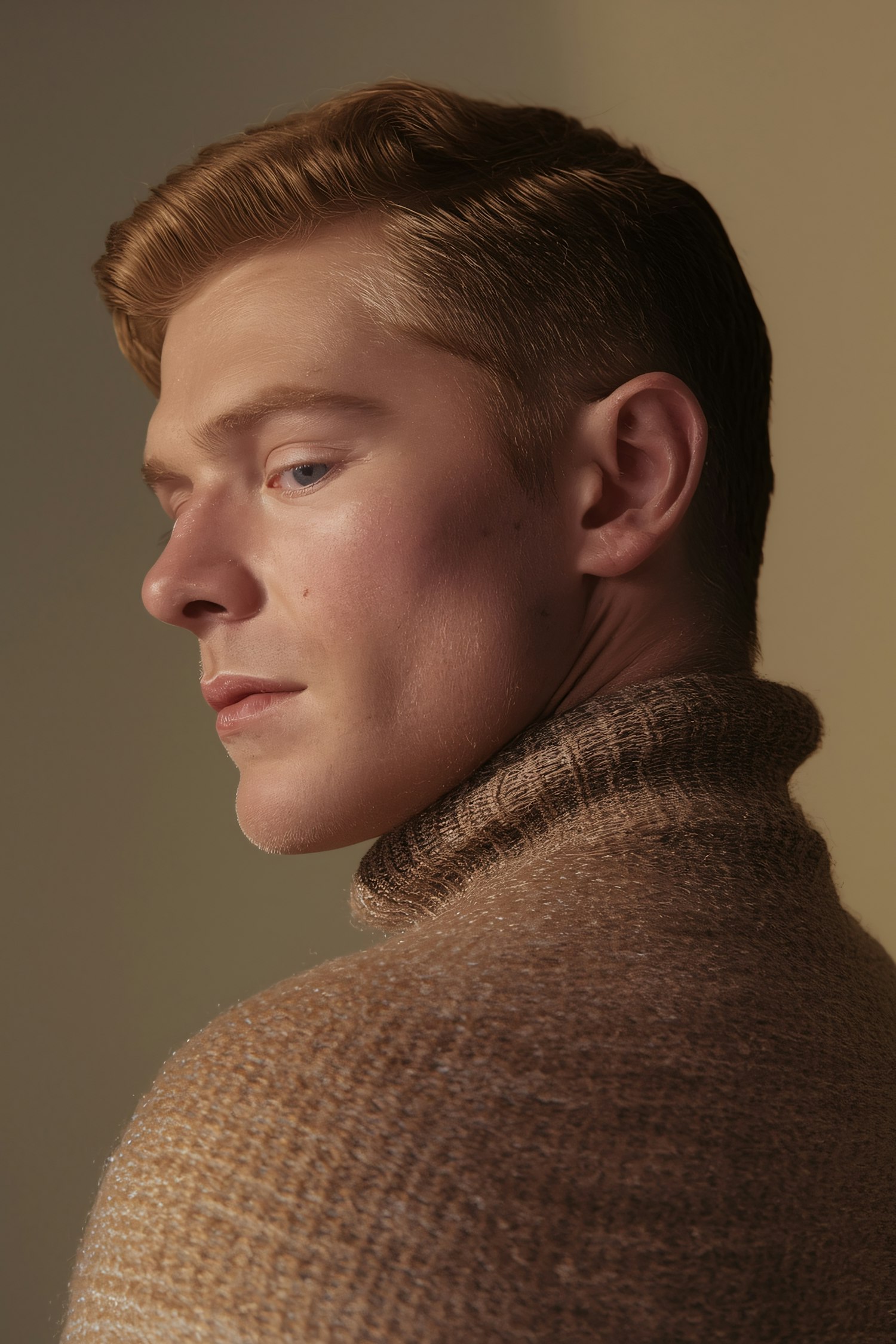 Close-up portrait of a person in a brown turtleneck, with light brown hair and a calm expression, set against a softly lit neutral background.