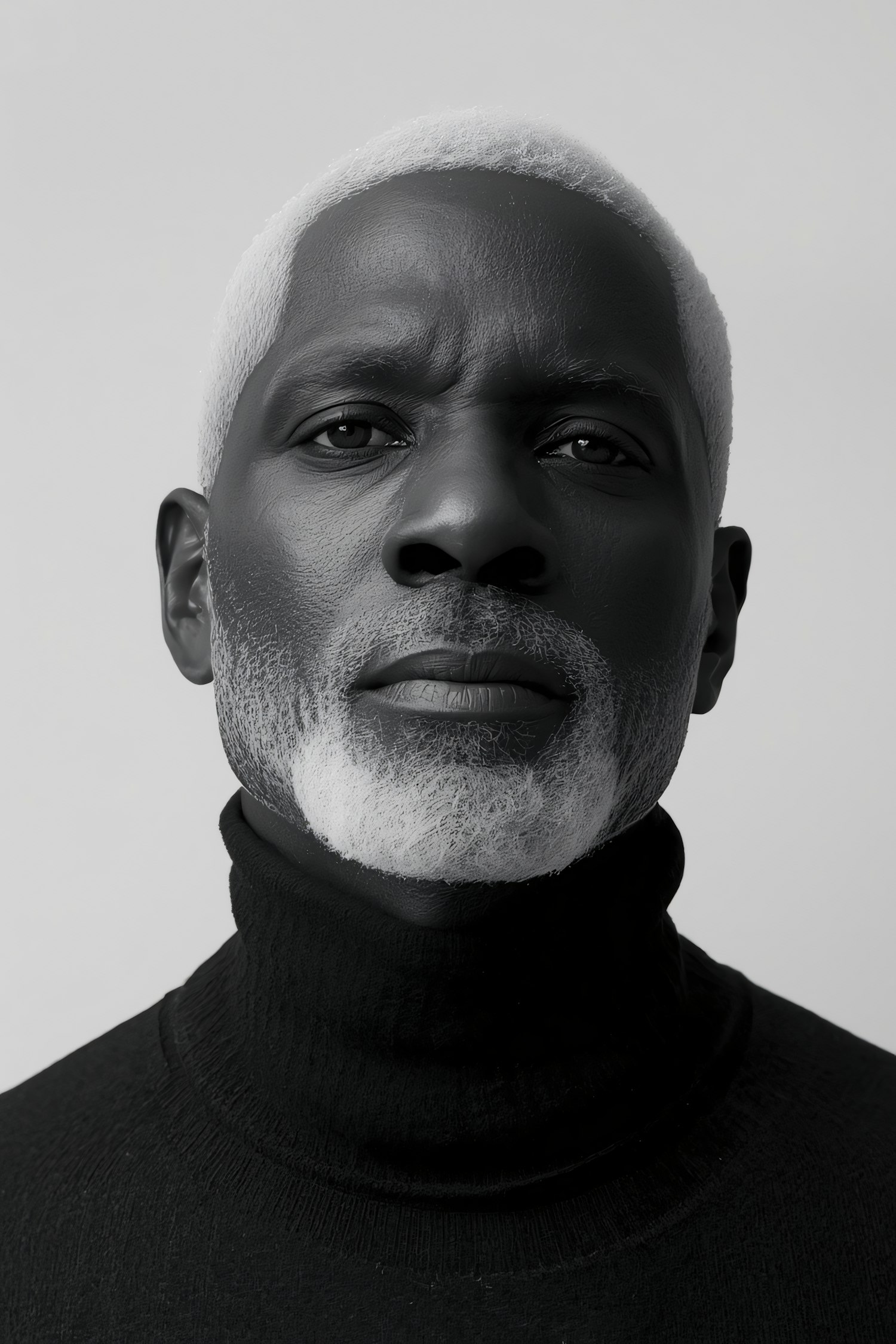 Close-up portrait of a man with dark skin, white hair, and a black turtleneck, set against a neutral gray background.