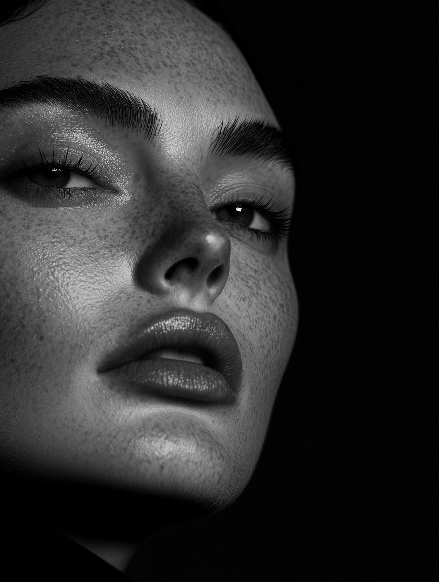 Striking black and white close-up portrait highlighting freckles, full lips, and dramatic lighting on a serene face.