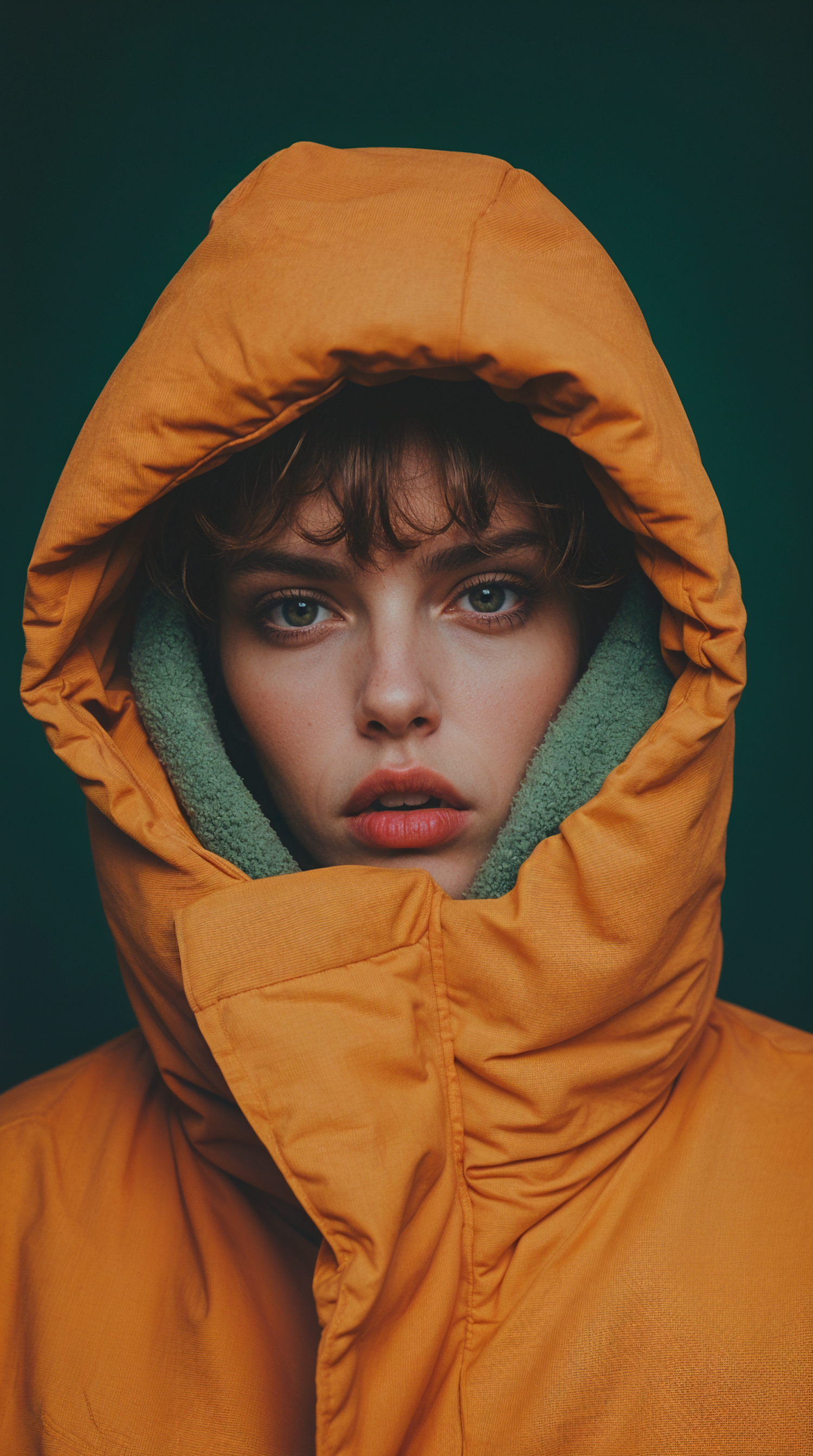 Close-up of a woman in an orange hooded jacket with green lining, piercing blue eyes, and a deep green background.