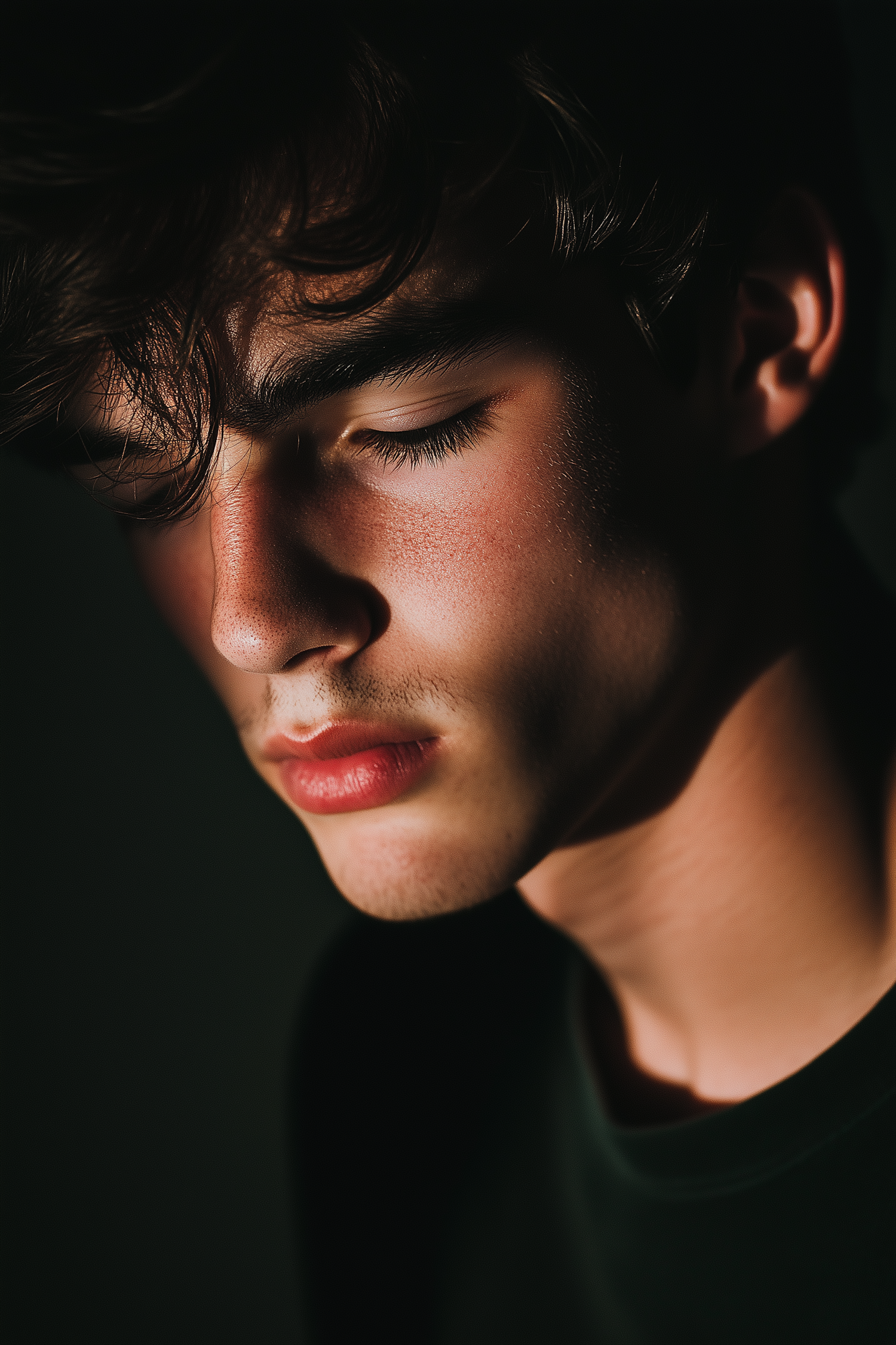 Close-up portrait of a young man with closed eyes, dramatic lighting, and tousled hair, creating a calm and introspective mood.
