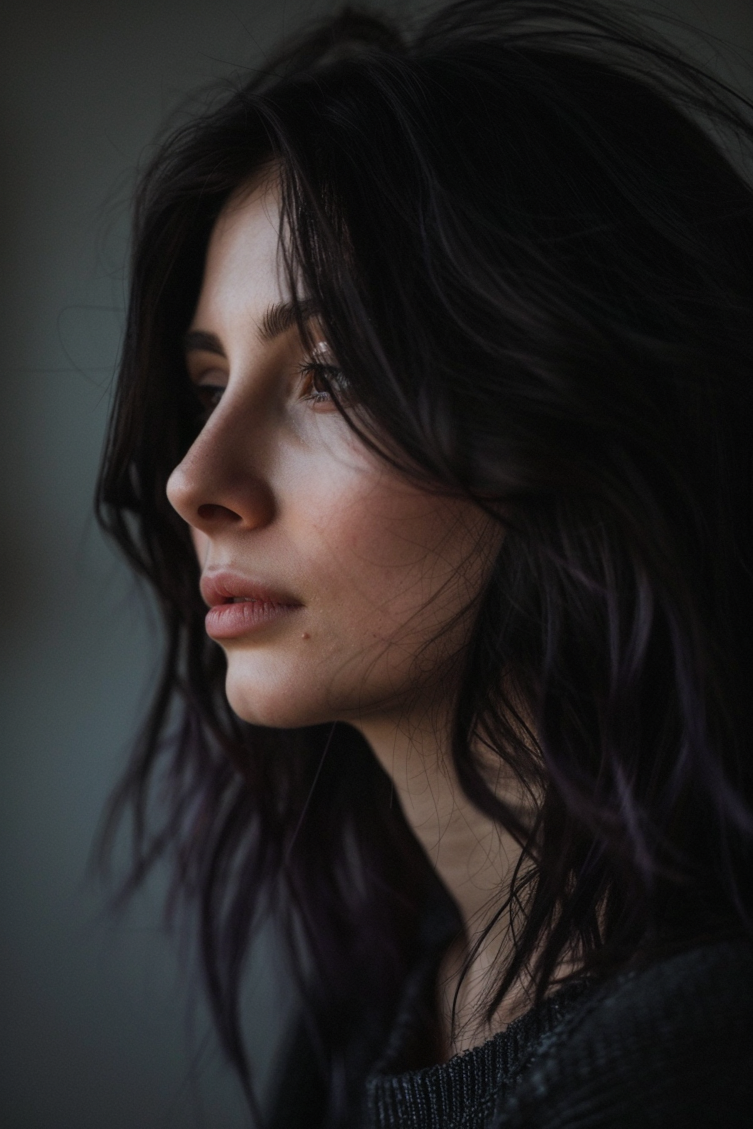 Close-up side profile of a young woman with dark wavy hair, soft lighting, and a calm, introspective expression.